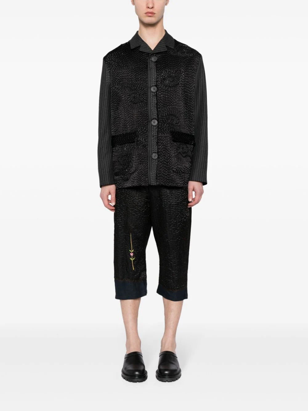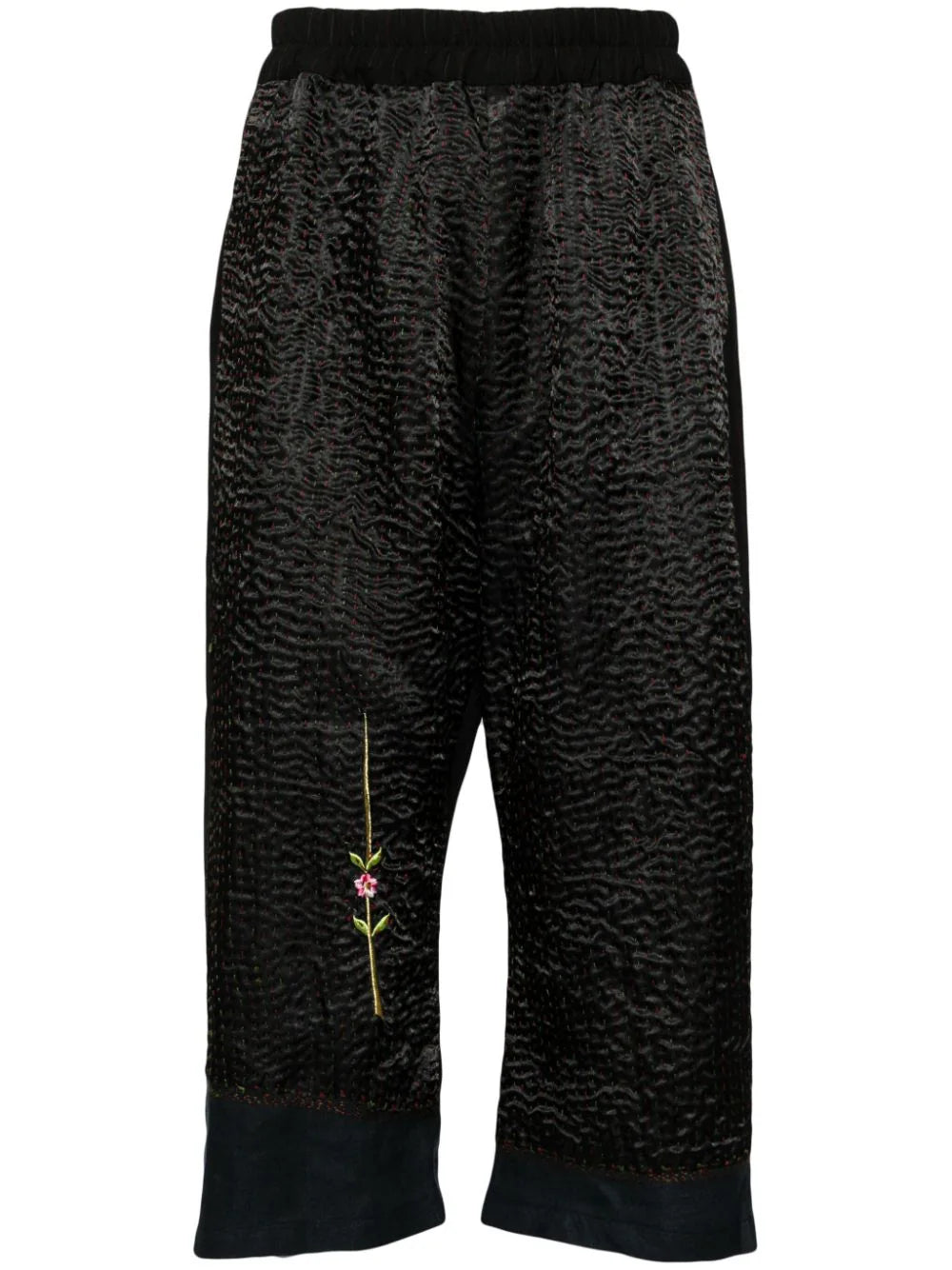 black cotton wool-silk blend floral embroidery straight leg elasticated waistband below-knee length