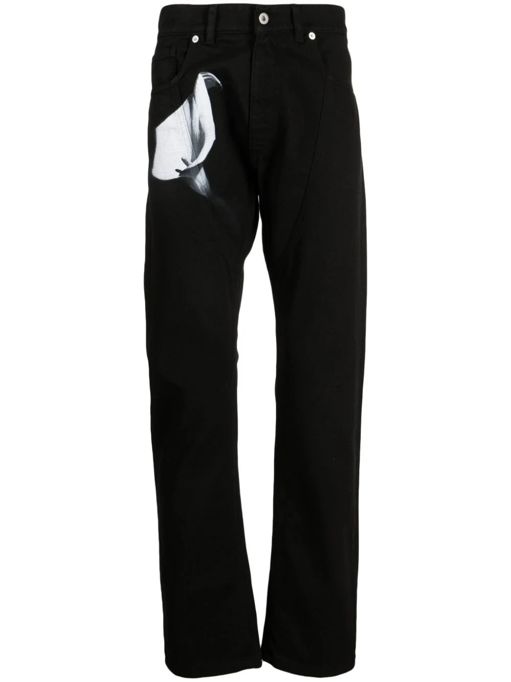 black cotton floral print high-waisted logo patch to the rear belt loops classic five pockets straight leg front button and zip fastening straight hem