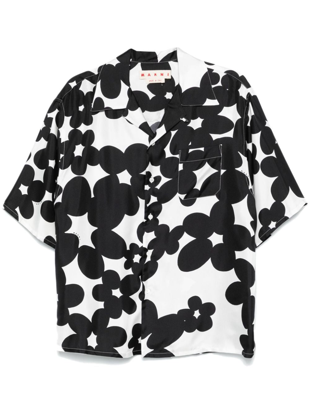 Expertly crafted from luxurious white and black silk, this Floral-Print Shirt boasts a sophisticated twill weave and eye-catching all-over floral print. With a convenient front button fastening, camp collar, and chest patch pocket, it's a versatile addition to any wardrobe. The drop shoulder, short sleeves, and straight hem offer a comfortable and flattering fit. Upgrade your style with this distinctive piece.