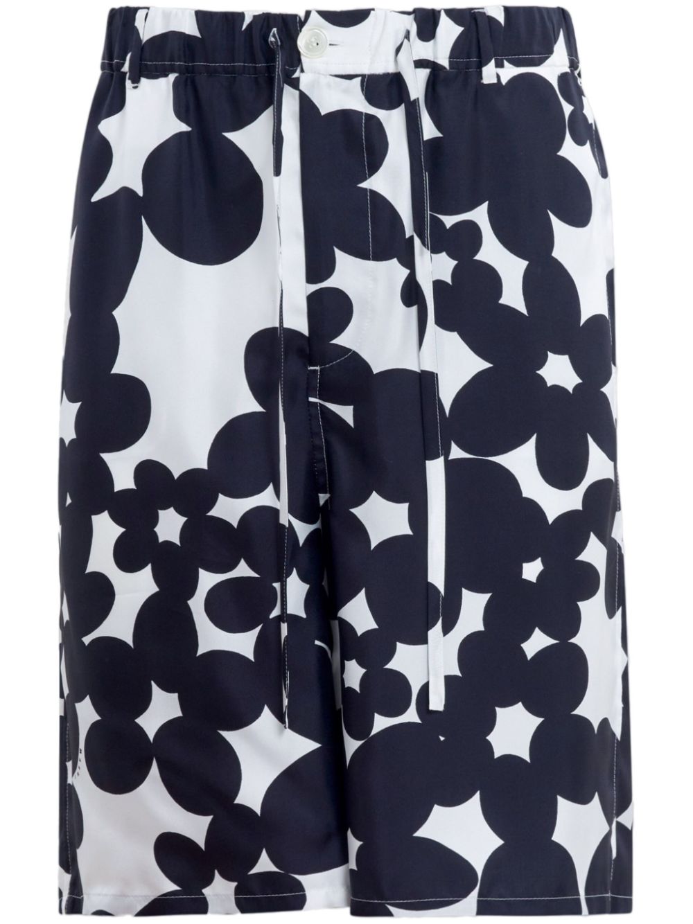 Expertly crafted from silk, these floral-print shorts feature an elasticated drawstring waistband for a comfortable fit. The front button and zip fastening, along with belt loops, add a touch of sophistication. With two rear jetted pockets and a wide leg design, these knee-length shorts are both stylish and practical.