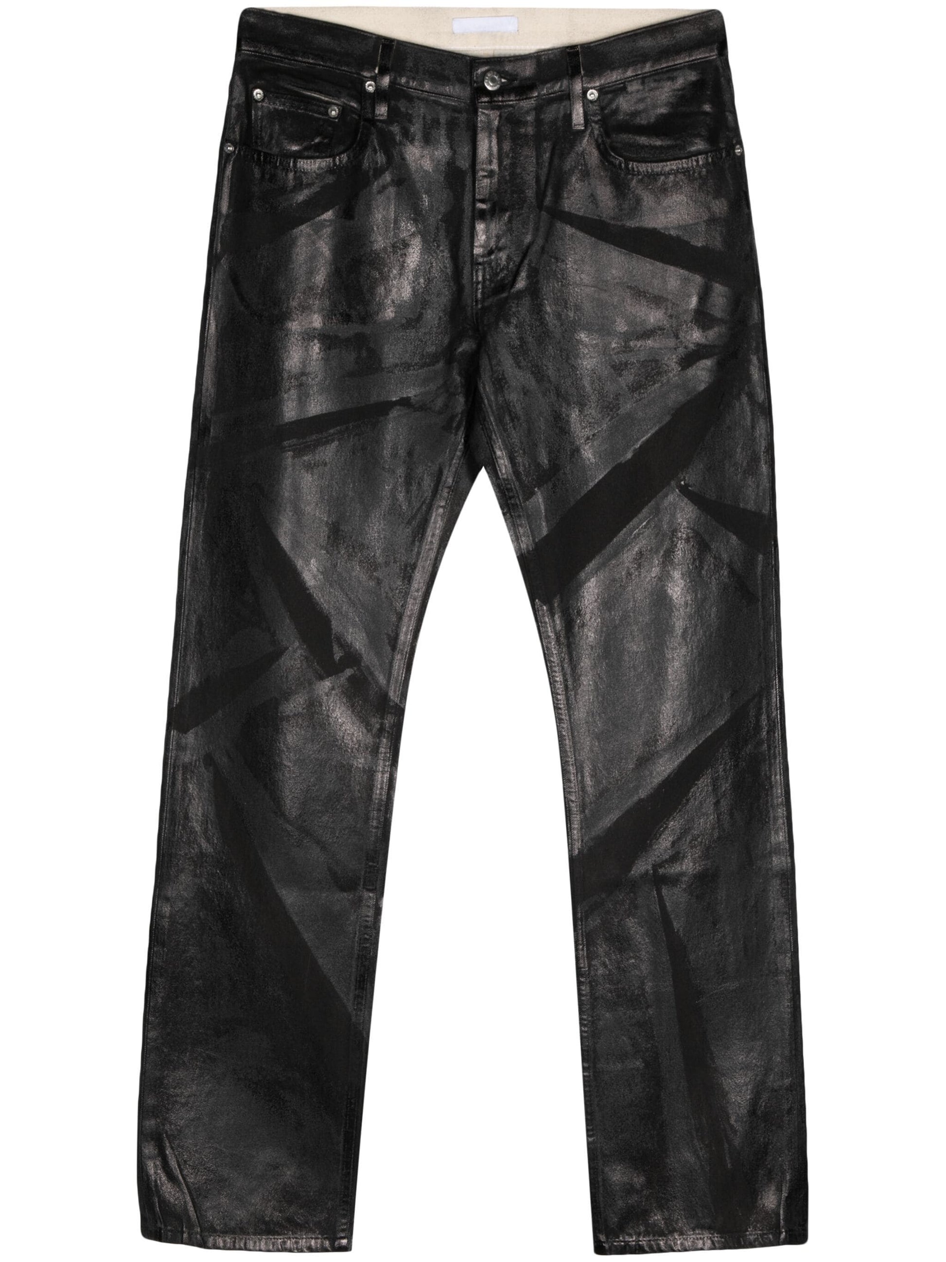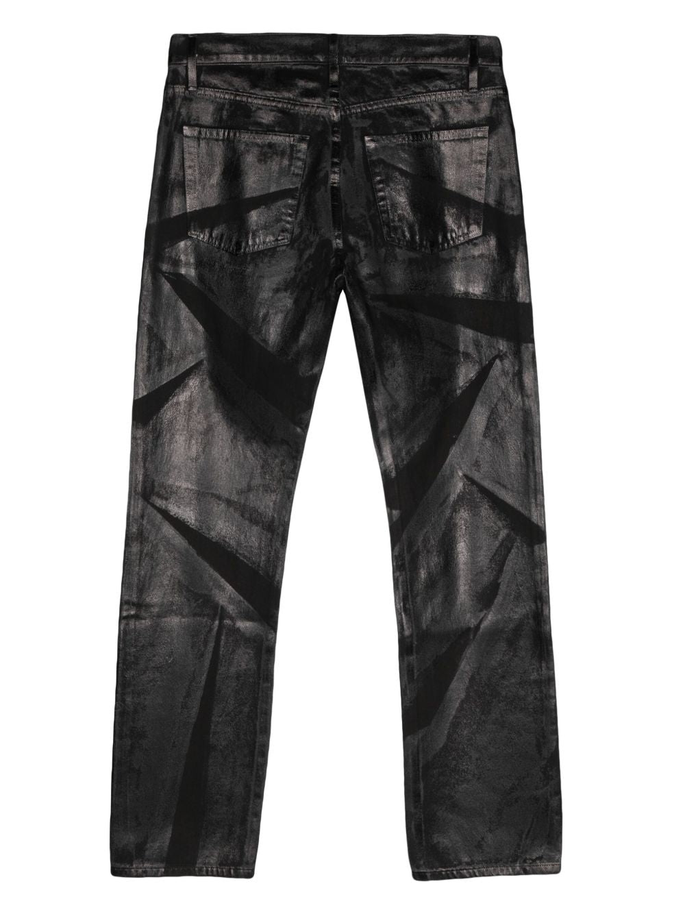 black cotton denim metallic finish all-over foil print low-rise belt loops front button and zip fastening classic five pockets straight leg