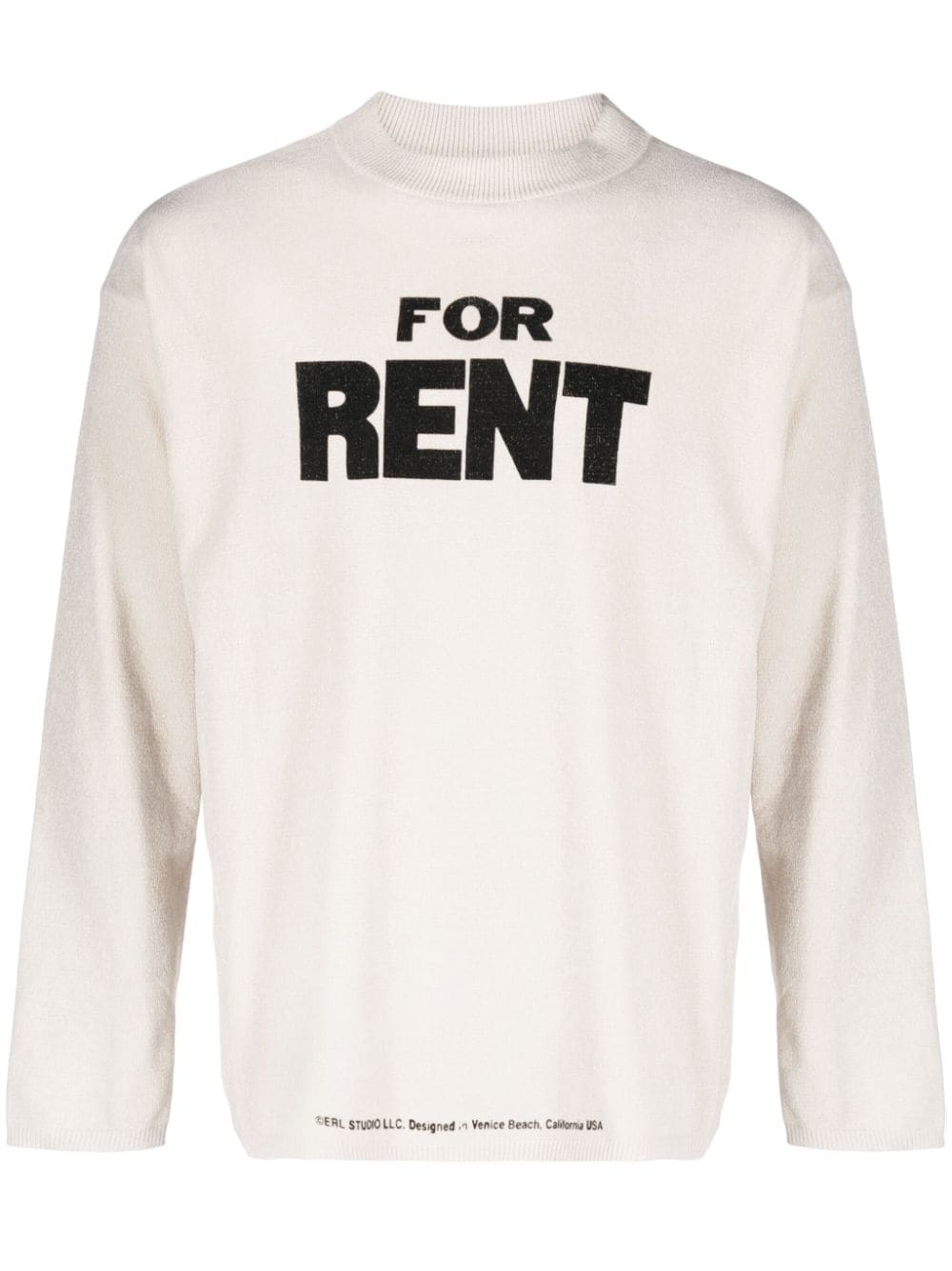 For Rent printed jumper from ERL featuring off-white, knitted construction, slogan print to the front, slogan print to the rear, crew neck, drop shoulder, long sleeves, ribbed trim and straight hem.