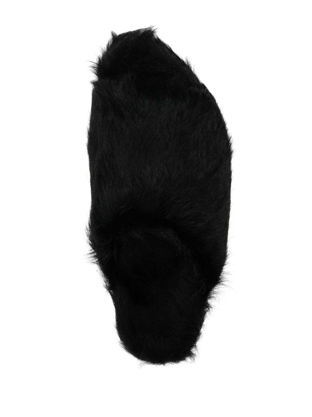 fured open-toe slides from Rick Owens featuring black, calf leather, calf hair, round open toe and flat rubber sole.