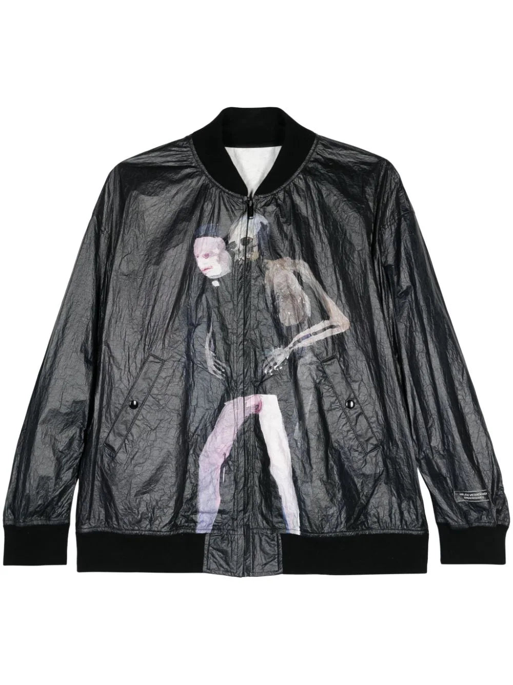 black textured finish crease effect baseball collar long sleeves ribbed cuffs and hem graphic print to the front two side welt pockets front zip fastening