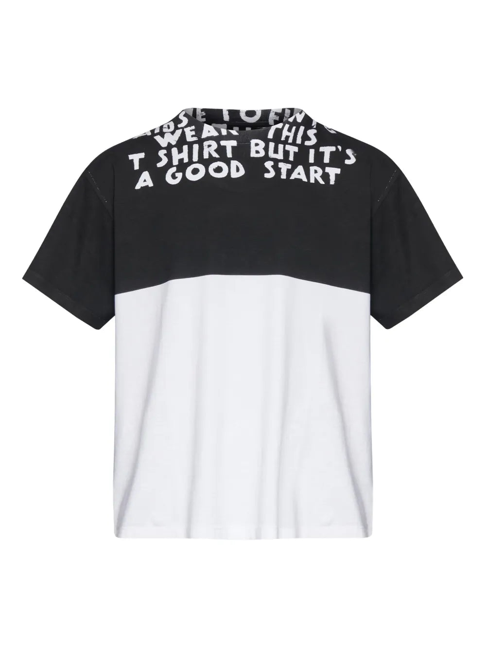 This Graphic-Print Panelled T-Shirt features bold black and white contrasting panels that create a modern, eye-catching look. The "I chose to wear this t-shirt but it's a good start" text adds a playful, confident touch. Designed with short sleeves and a relaxed fit, it ensures comfort and ease for everyday wear while making a stylish statement.