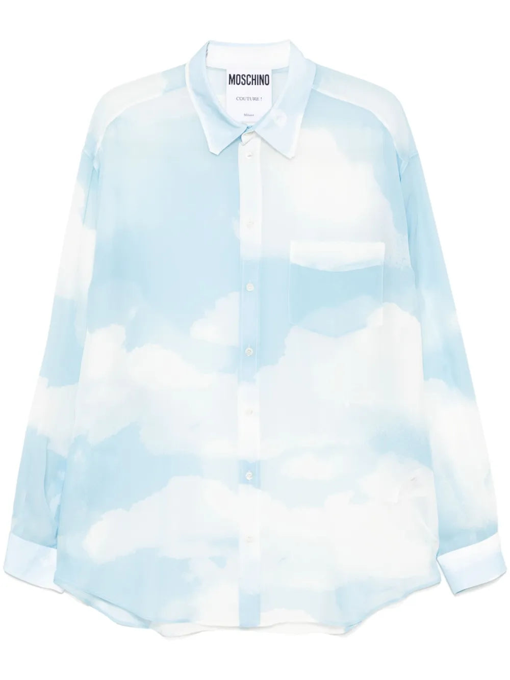 Expertly crafted with a semi-sheer construction, this Graphic-Print Shirt features a sky blue color and a front button fastening for easy wear. Complete with a convenient chest patch pocket, this shirt combines practicality and style for a sleek and sophisticated look.