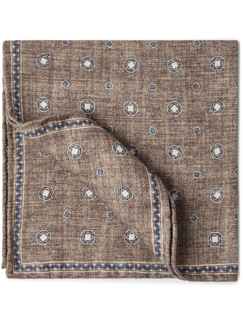 Enhance your formal look with our Graphic-Print Silk Pocket Square. Made with luxurious brown silk, this square features an all-over graphic print and finished edges for a polished touch. Add a touch of sophistication and style to your ensemble with this unique accessory.
