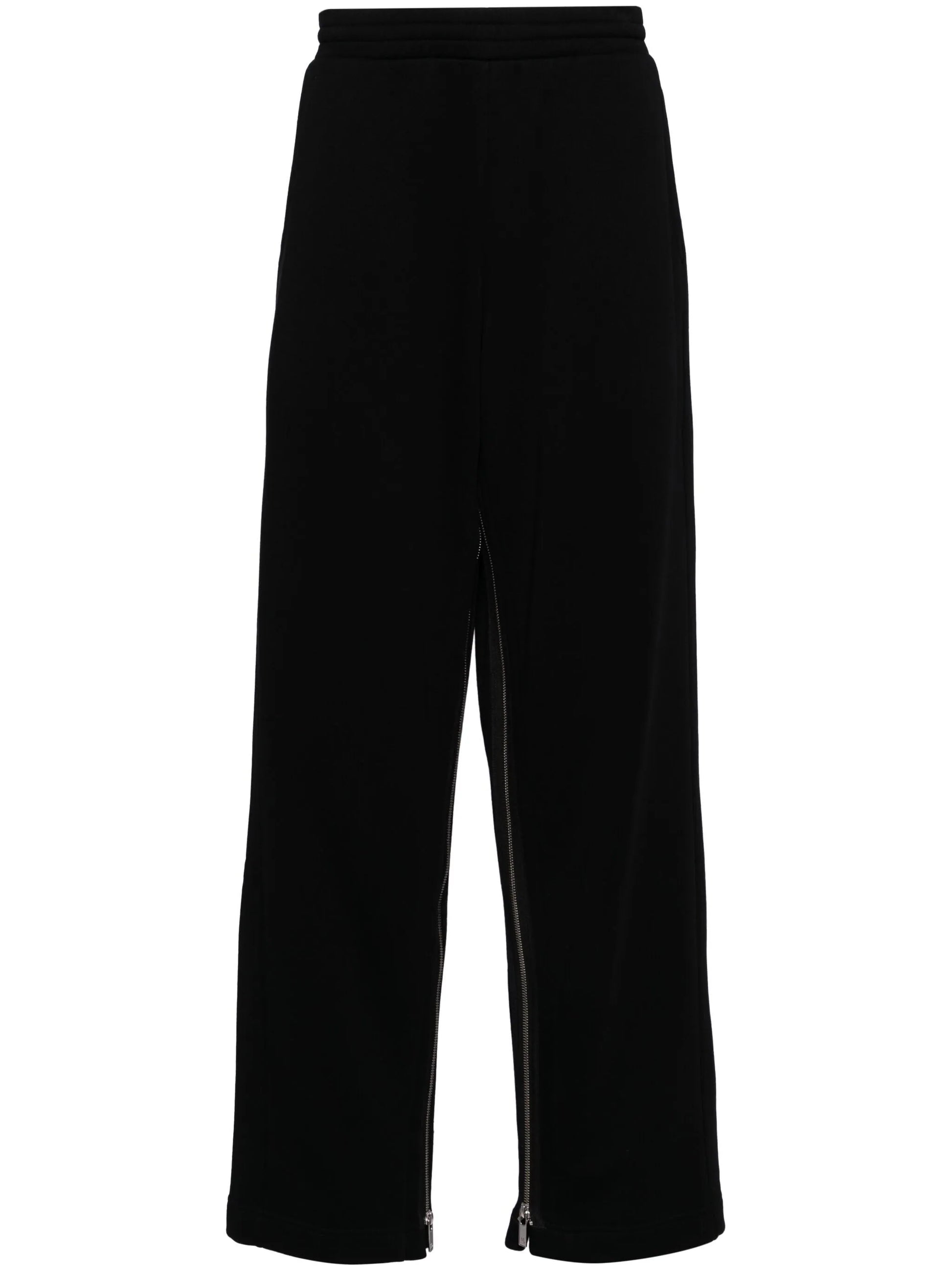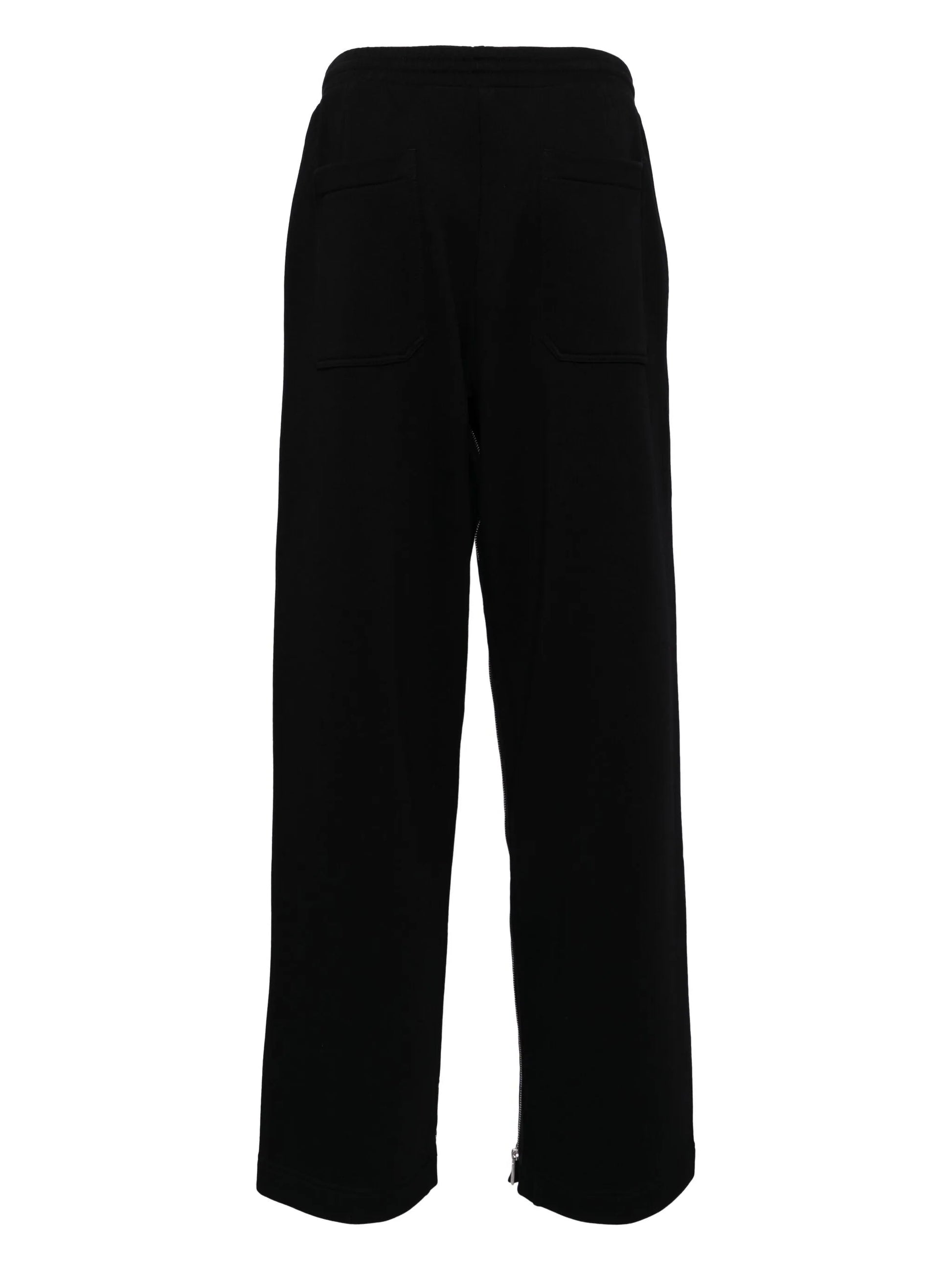 black cotton elasticated waistband two side inset pockets two rear patch pockets side zip fastening straight leg long length