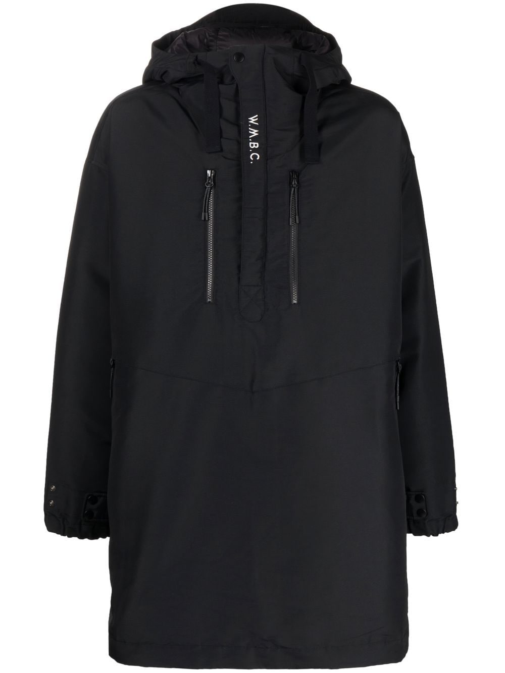 half zip-up padded jacket from WHITE MOUNTAINEERING featuring black, half front zip fastening, two zip-fastening chest pockets, embroidered logo at the chest, drawstring hood, drop shoulder, long sleeves, belted cuffs, drawstring hem and rear curved hem.