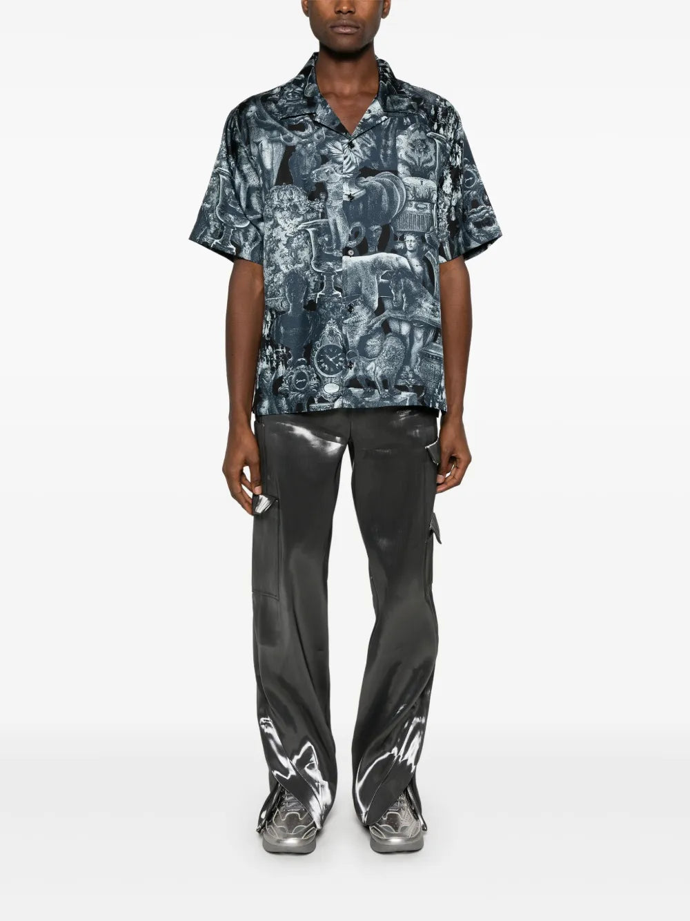 The Hubert Objects-Print Silk Shirt features an elegant silk satin weave with a unique indigo blue and multicolour print of Hubert objects. Its camp collar, front button fastening, and short sleeves provide effortless style, while the side slits and straight hem add comfort and versatility.