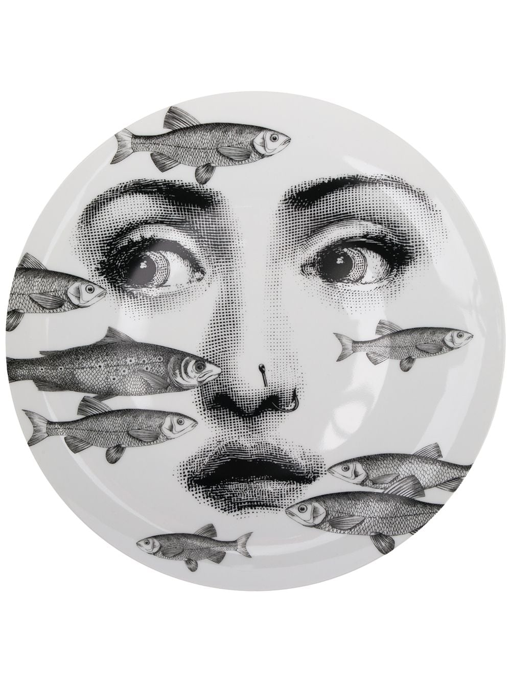 White and black ceramic illustrated plate from Fornasetti featuring a digital print.