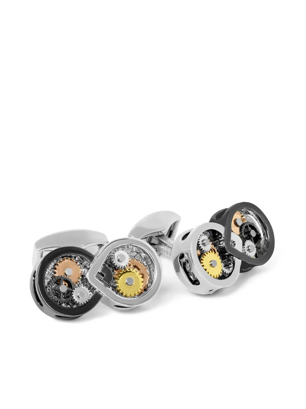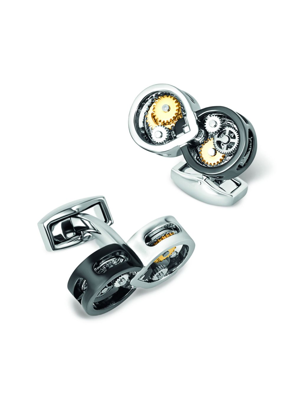 Expertly crafted with a polished finish, Infinity Gear Cufflinks feature a silver and black gear detail with rotating elements. The toggle closure ensures a secure fit while the elegant design adds a touch of sophistication to any outfit. Perfect for the stylish and discerning gentleman.