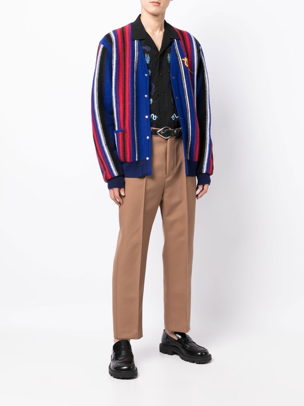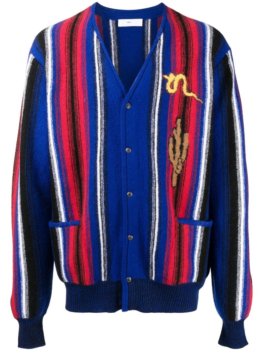 intarsia-knit V-neck cardigan from TOGA VIRILIS featuring intarsia knit, two side patch pockets, front button fastening, V-neck, long sleeves, ribbed cuffs, ribbed hem, multicolour and wool.