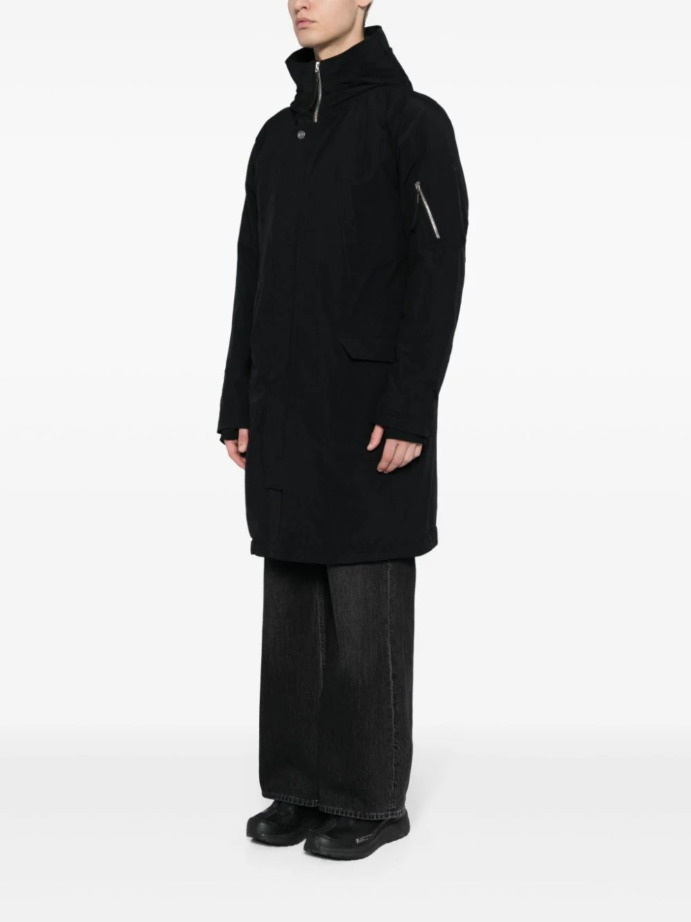 black cotton blend wind-resistant funnel neck classic hood front press-stud and zip fastening long raglan sleeves thumb slots sleeve zip pocket two chest welt pockets two front flap pockets long length straight hem