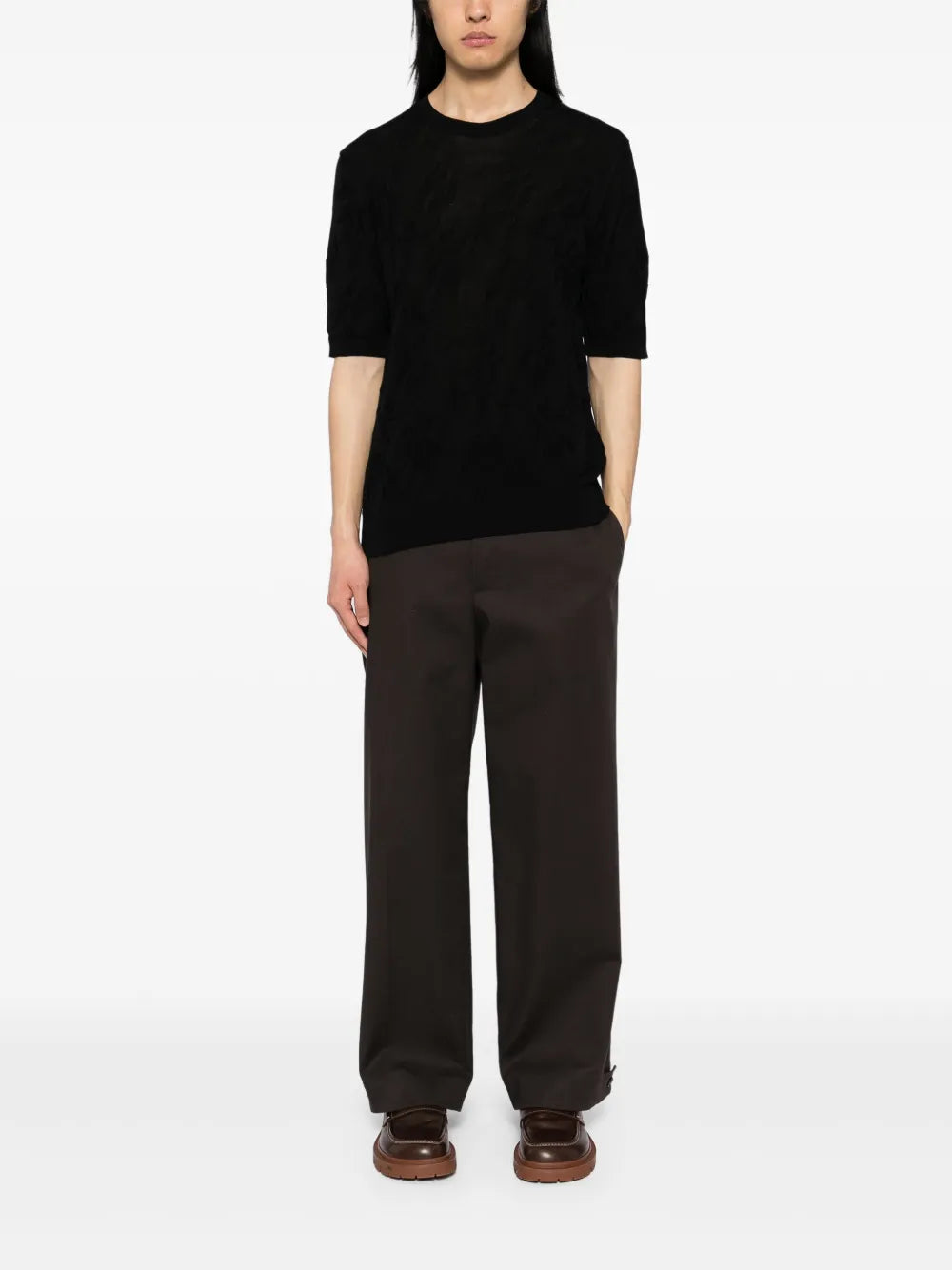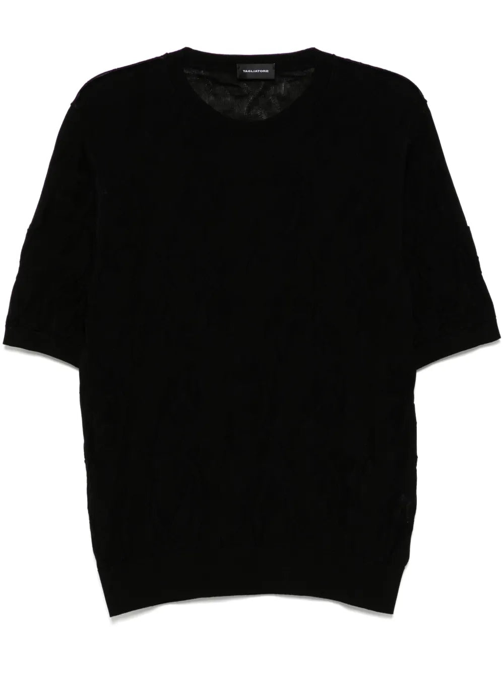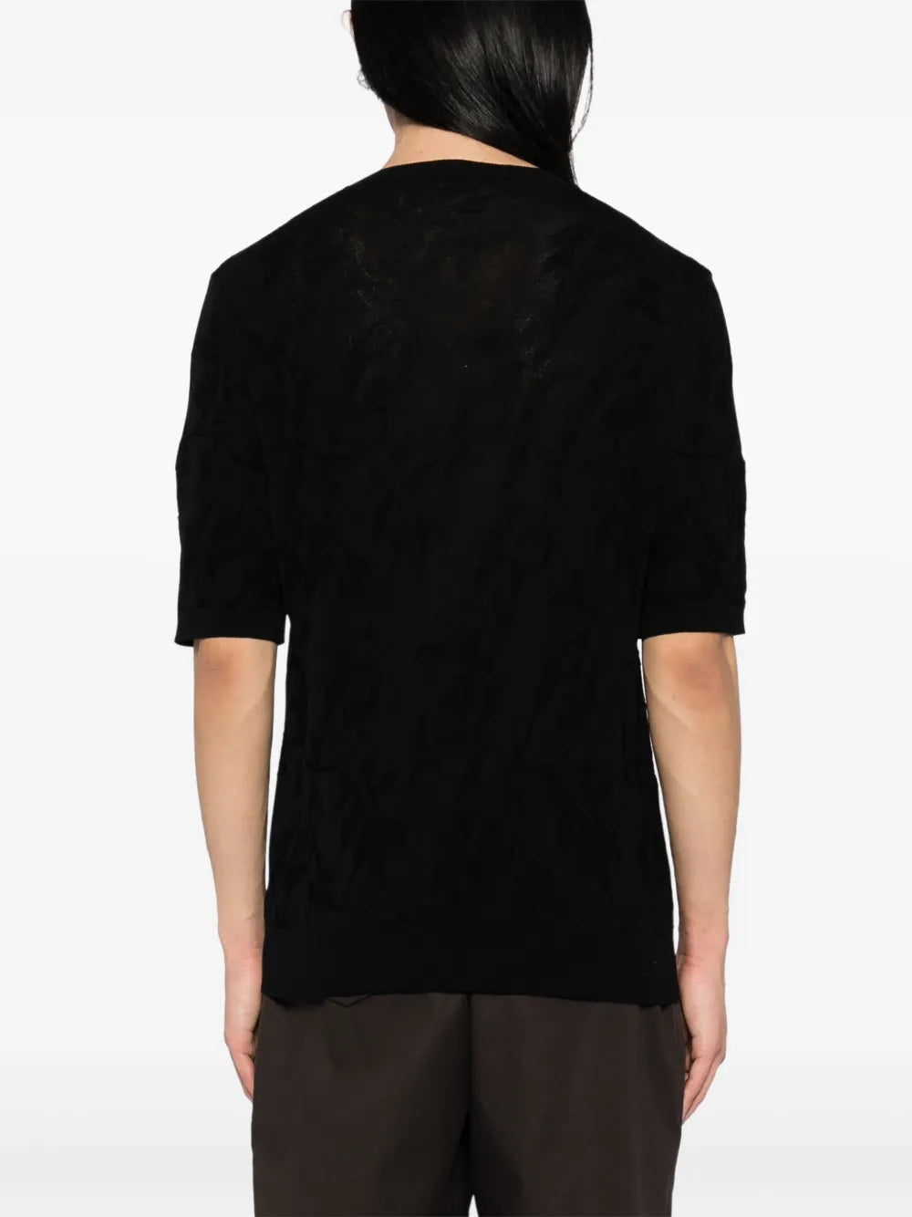 This knitted t-shirt features a sleek black design with a crew neck and ribbed cuffs and hem. Crafted with high-quality materials, it offers both comfort and style for any occasion. Elevate your wardrobe with this versatile and sophisticated piece.