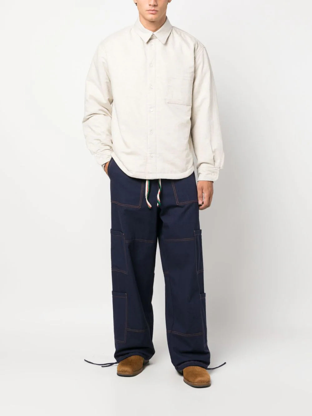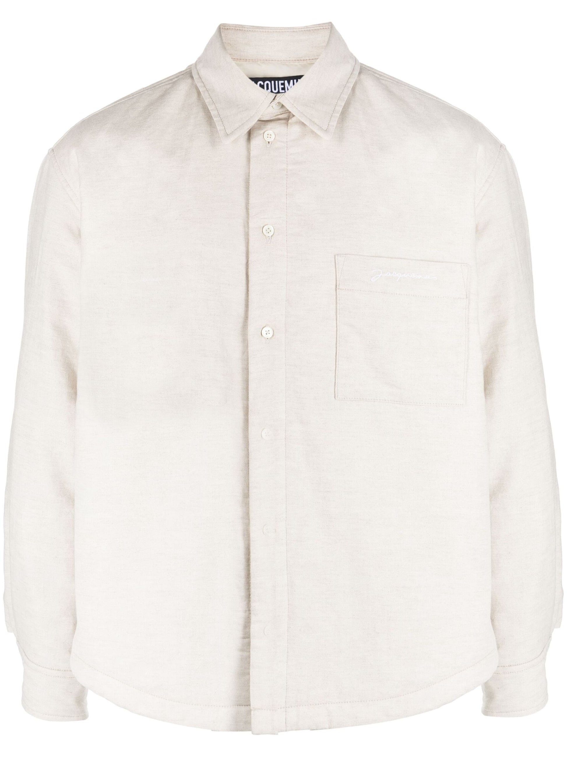 ecru cotton/linen embroidered logo at the chest classic collar front button fastening chest patch pocket long sleeves buttoned cuffs curved hem