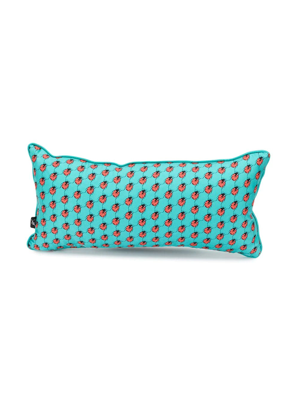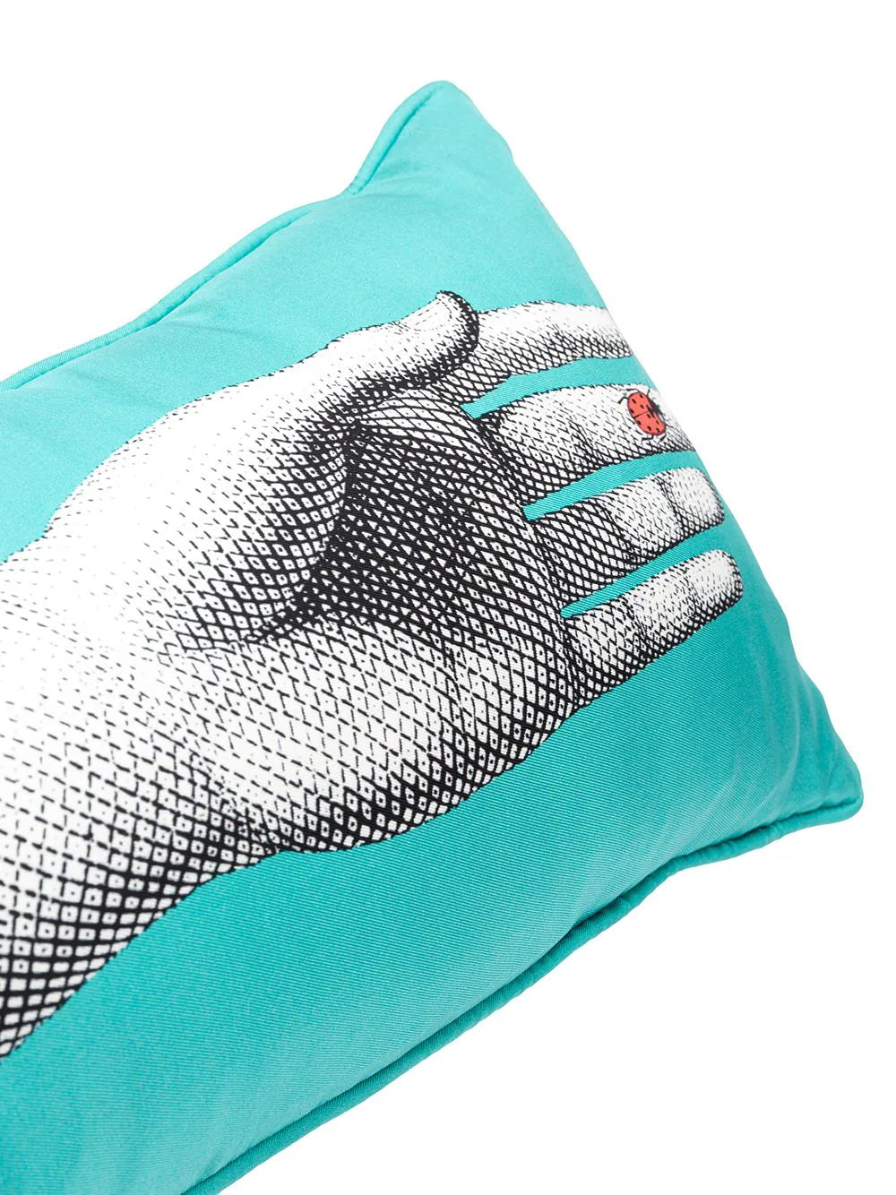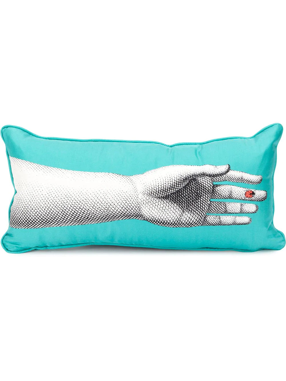 Turquoise silk lady bug pillow from Fornasetti featuring a lady bug print and a printed hand. This item comes with a gift box.