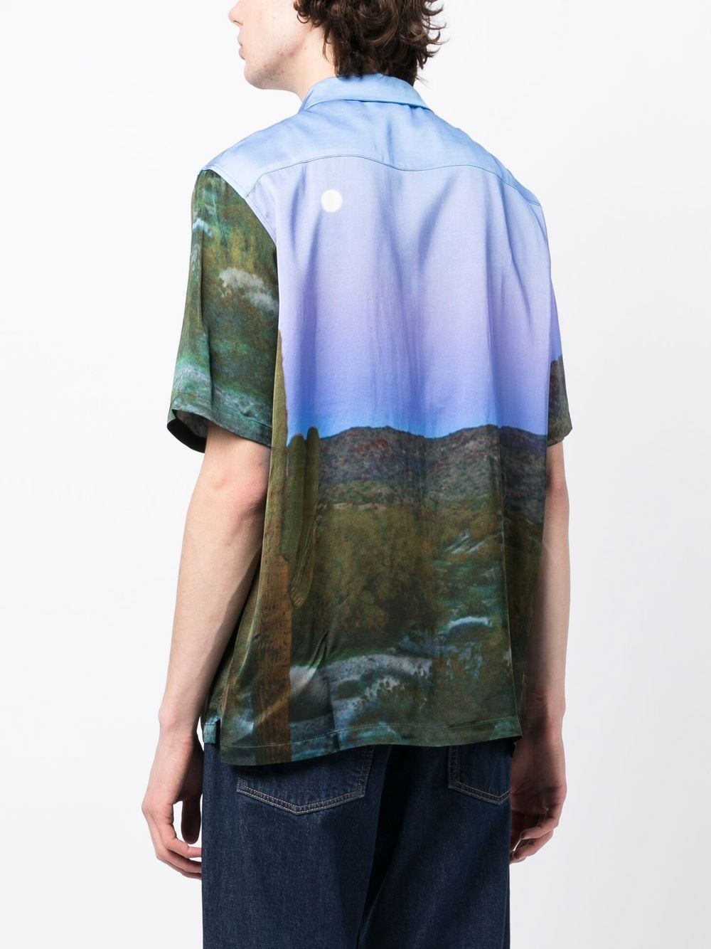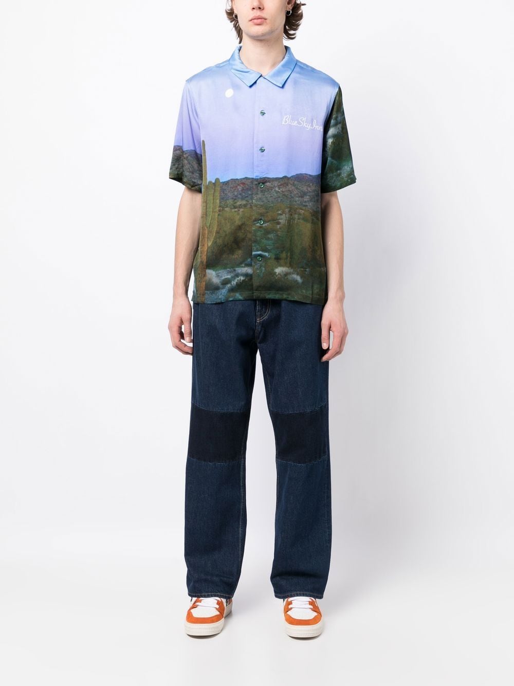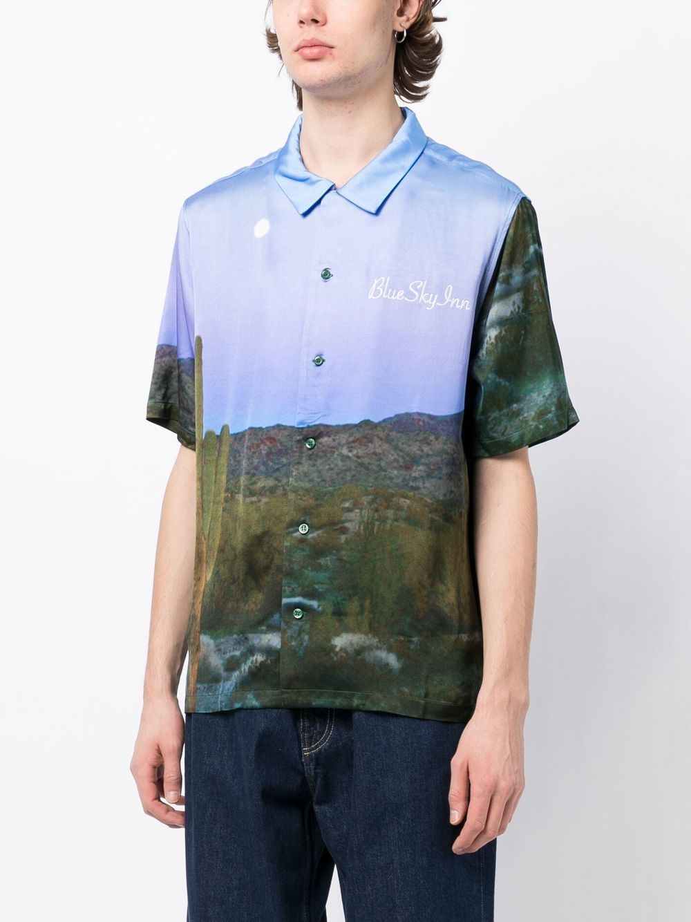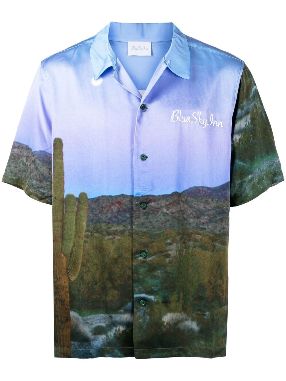landscape print short-sleeve shirt from BLUE SKY INN featuring dark green, sky blue, all-over graphic print, embroidered logo at the chest, classic collar, front button fastening, short sleeves and straight hem.
