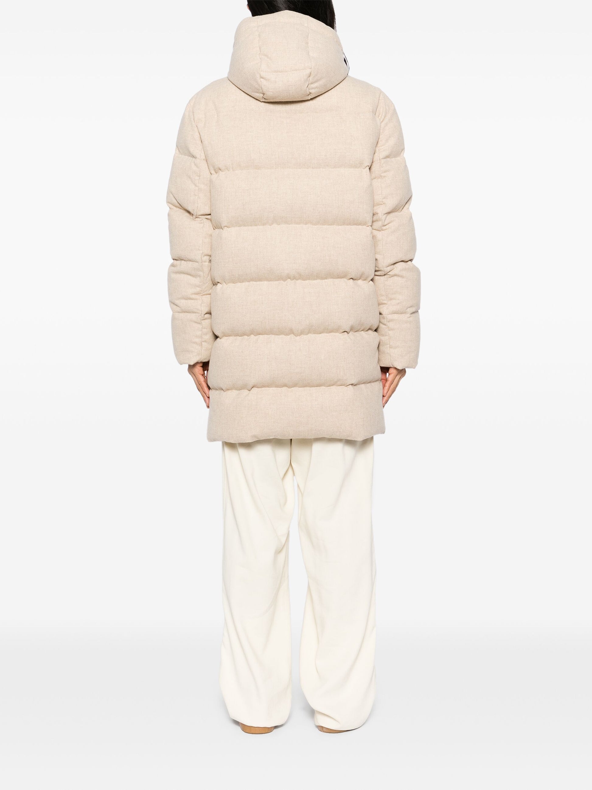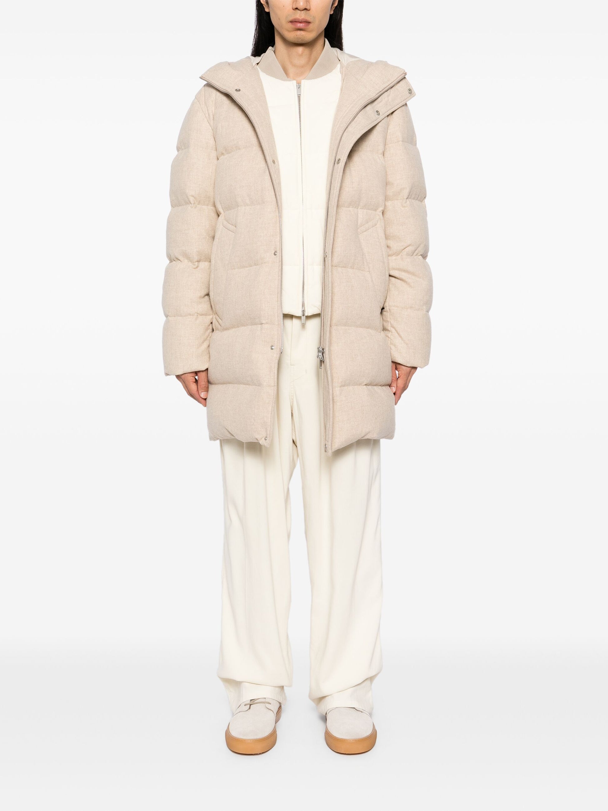 This Layer Puffer Jacket is crafted with a beige wool blend and filled with duck down for ultimate warmth. Its layered design adds modern style, while the baseball collar and classic hood provide extra protection. Featuring a front zip and press-stud fastening, ribbed cuffs, and two front welt pockets.