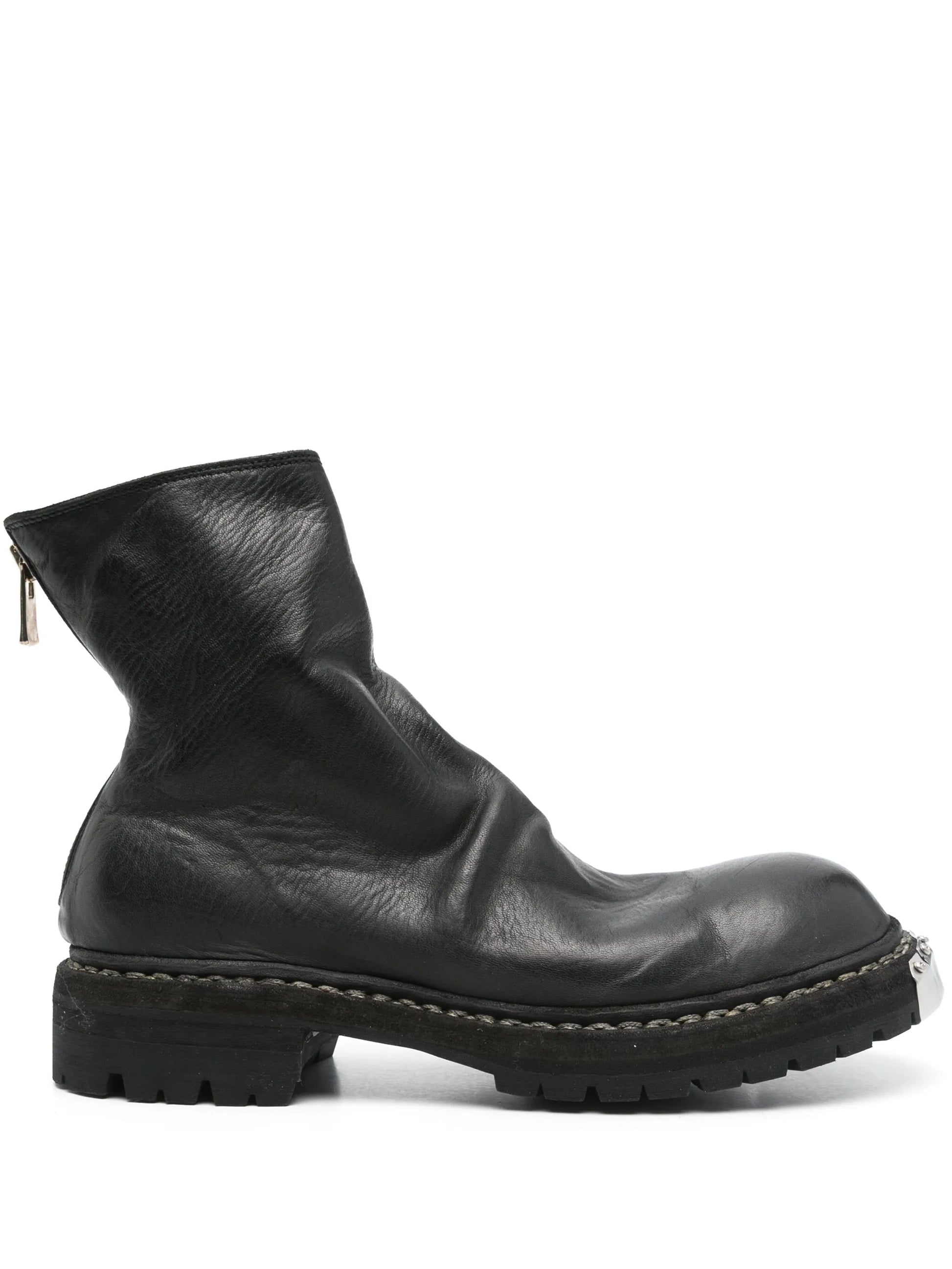 These black leather boots feature a rear zip fastening for easy wear and a durable rubber lug sole designed to provide reliable traction. Equipped with a metal toecap for added protection and a branded insole for comfort, they blend functional craftsmanship with a sleek, modern aesthetic.