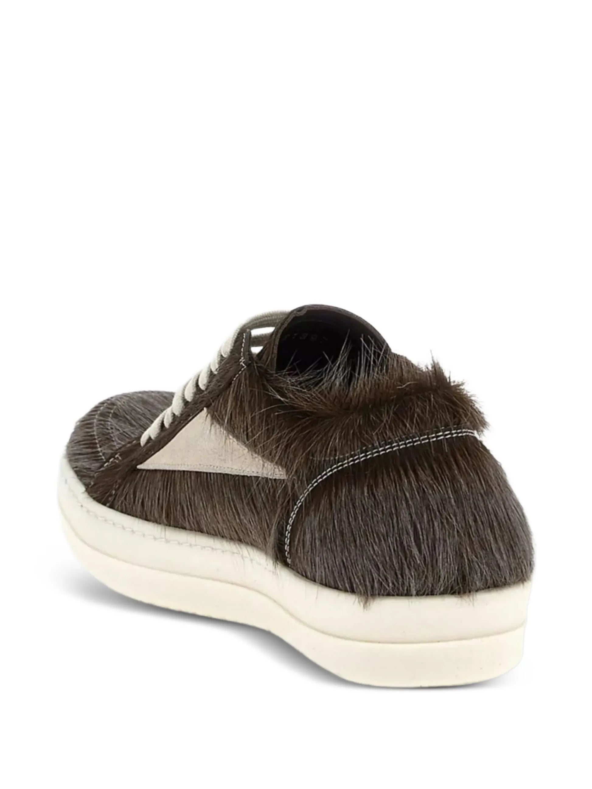 The Leather Fur-Appliqué Sneakers in brown blend textured fur accents with refined leather craftsmanship. Featuring detailed appliqué and a lace-up fastening, they provide both style and secure fit. The flat sole ensures comfortable wear for daily use, making these sneakers a sophisticated choice for merging luxury elements with practical footwear design.