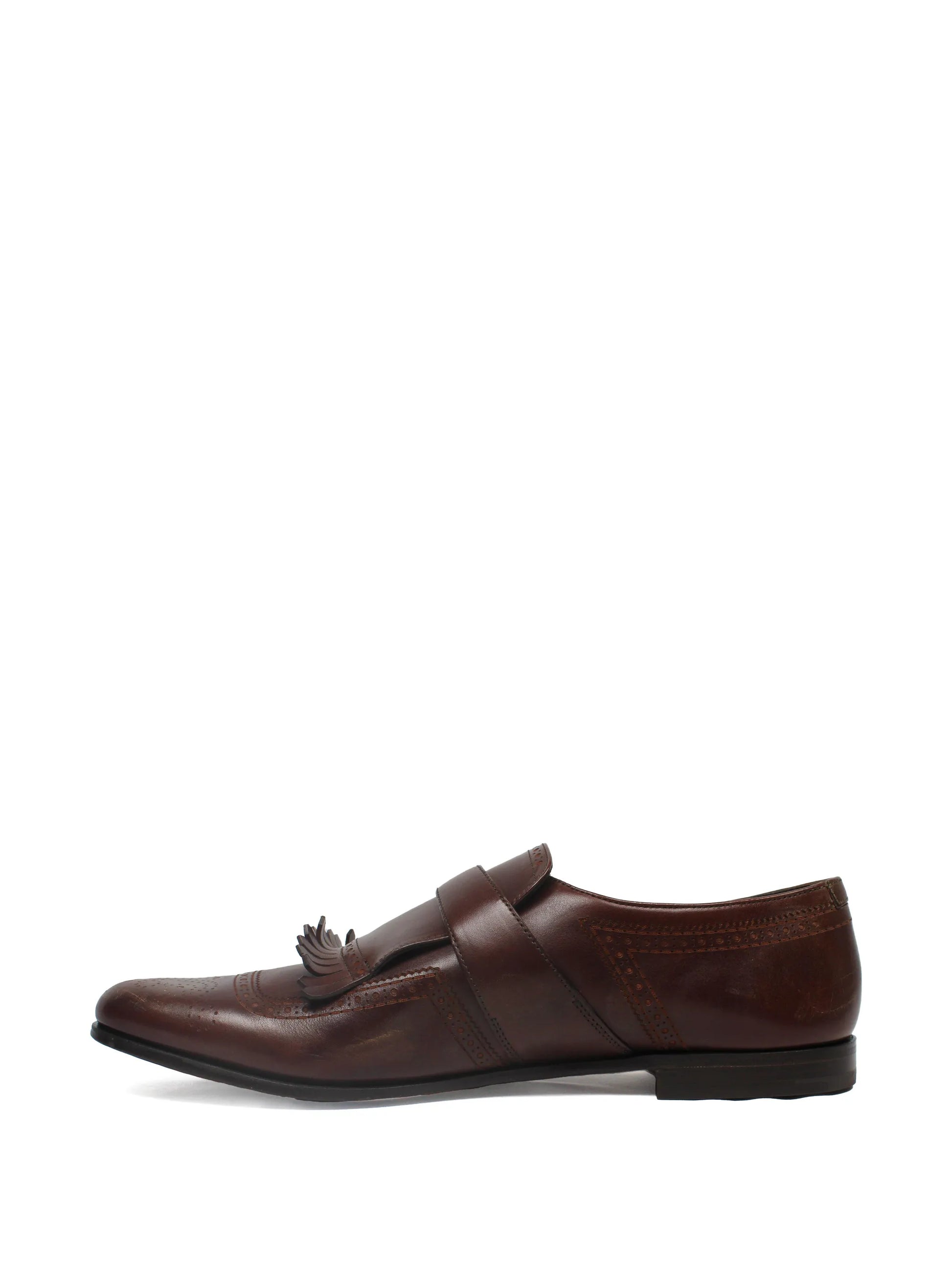 Elevate your footwear collection with these dark brown leather monk shoes, a timeless choice for the discerning professional. The distinctive buckle fastening replaces traditional laces, offering both convenience and refined aesthetics. Intricate brogue detailing adds visual sophistication, whilst a decorative tassel enhances the classic silhouette. A genuine leather sole ensures durability and authentic craftsmanship. Perfect for formal occasions or elevated business settings, these shoes deliver enduring style and uncompromising quality.