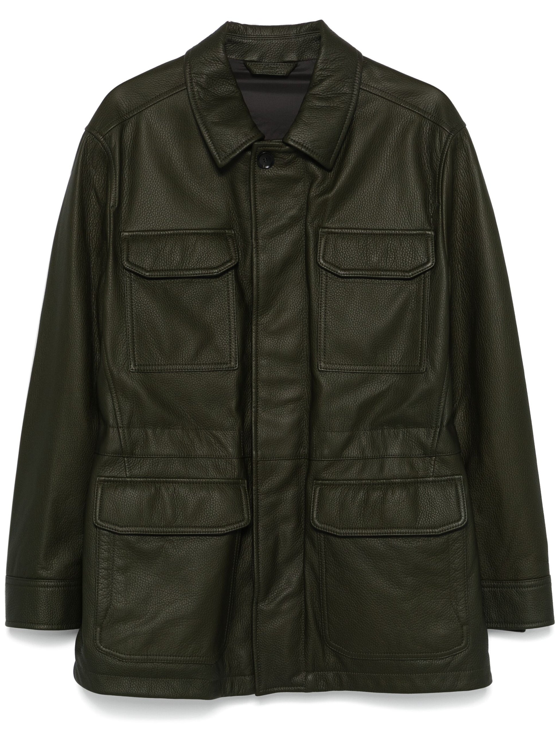 This olive green leather Sahariana jacket is made of deerskin with a grained texture. It features a classic collar, long sleeves with buttoned cuffs, and a concealed front fastening. The jacket also has four front flap pockets, two side slit pockets, and an internal drawstring fastening waist. With its full lining and straight hem, it's both stylish and functional.