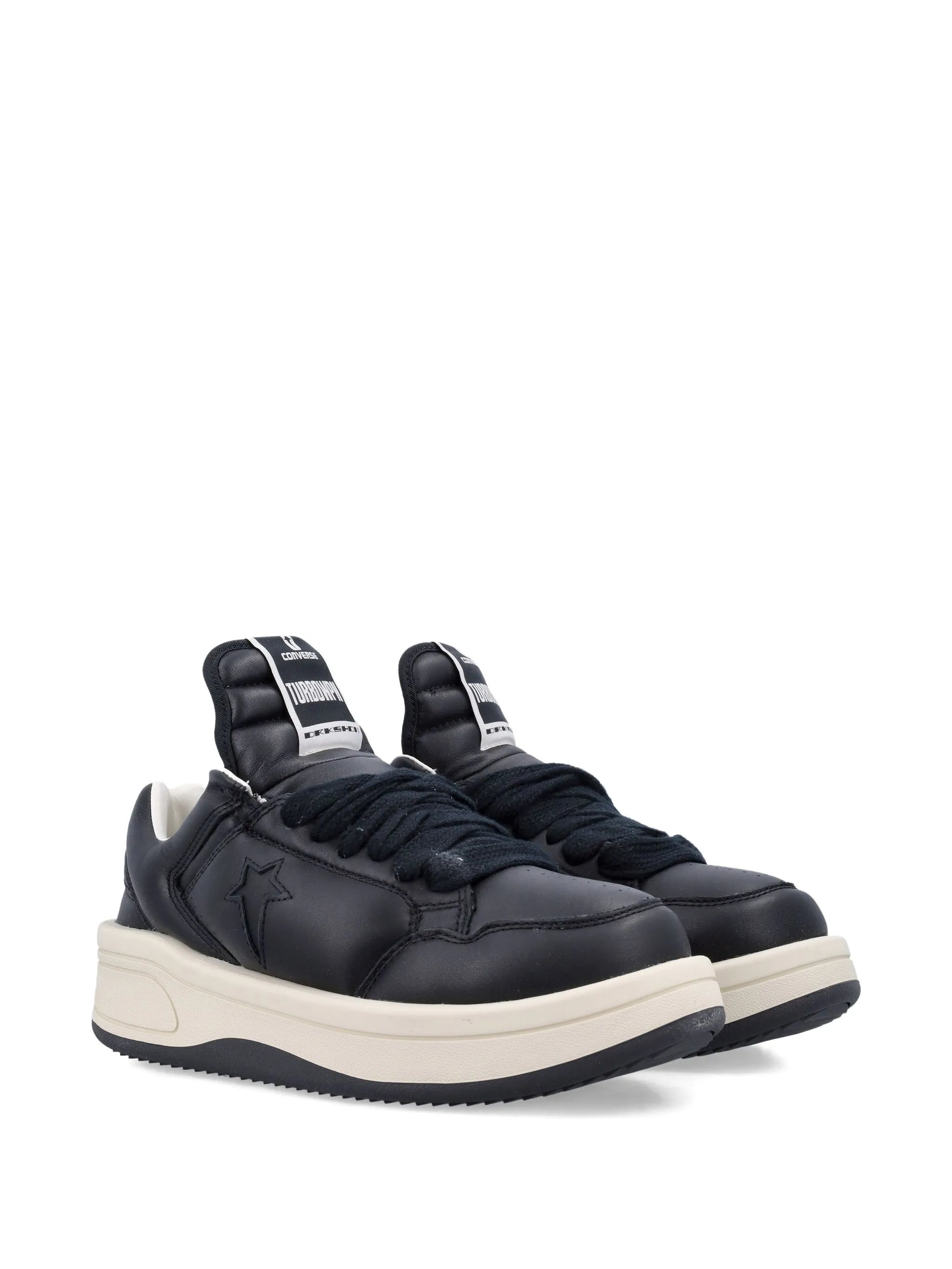 Expertly crafted with a classic black leather design, these sneakers feature a front lace-up fastening for a secure fit and a flat rubber sole for superior traction. The logo patch at the tongue adds a touch of style, while the branded insole provides comfort and support. Perfect for any casual or athletic occasion.