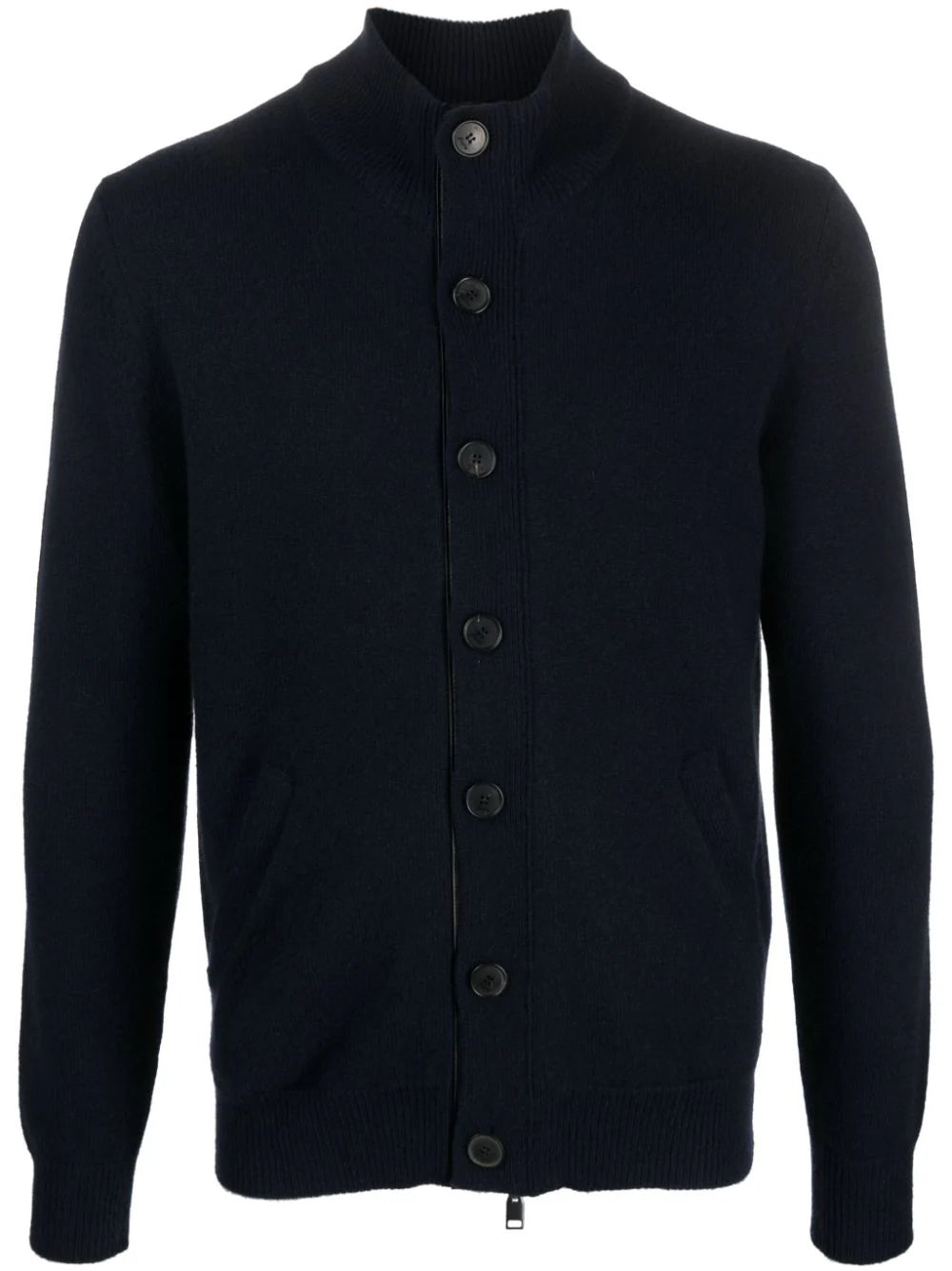 leather-trimmed cashmere cardigan from BRIONI featuring navy blue, cashmere, fine knit, leather trim, concealed front zip fastening, front button fastening, long sleeves, two diagonal pockets to the sides and ribbed-knit edge.