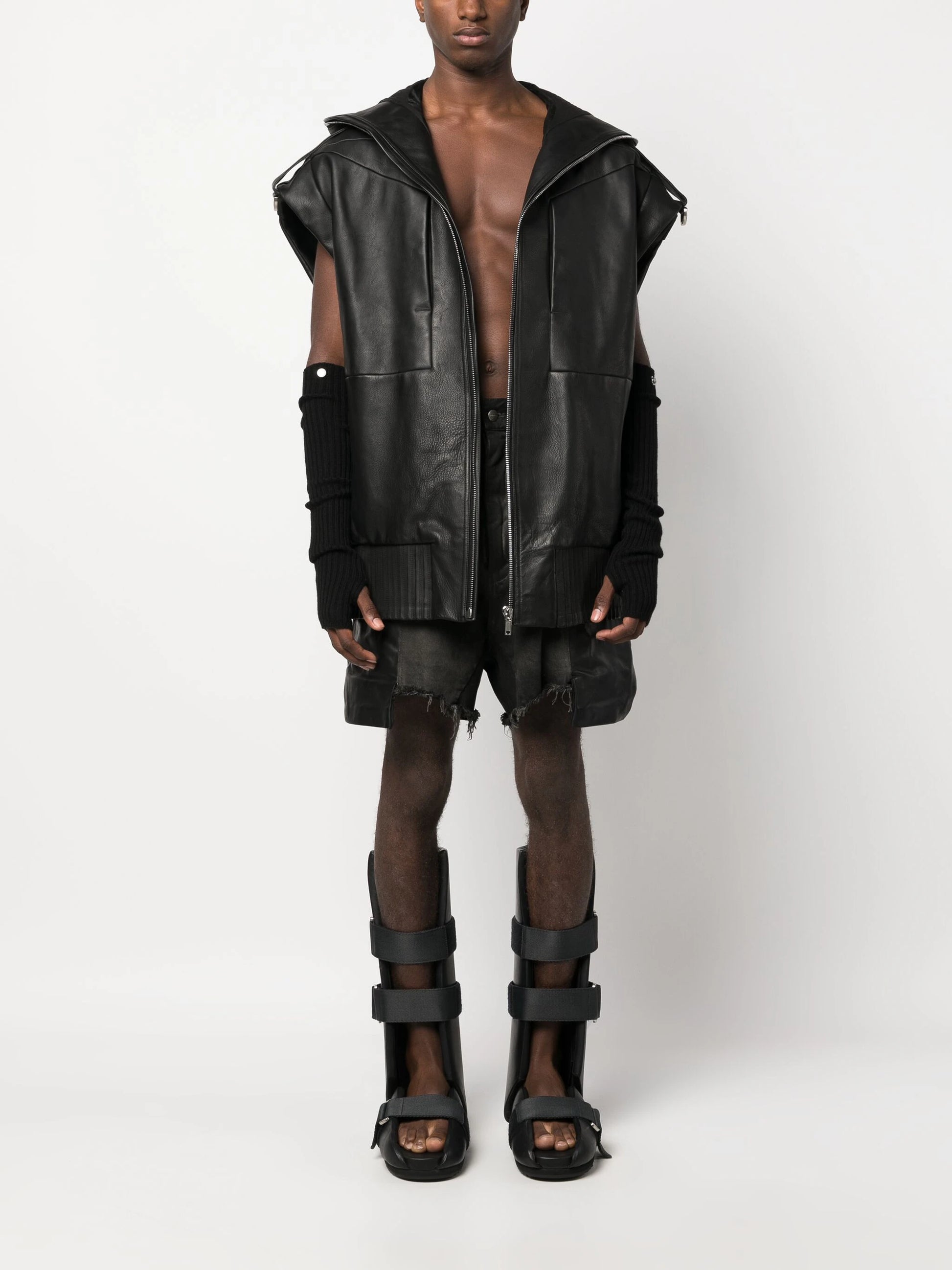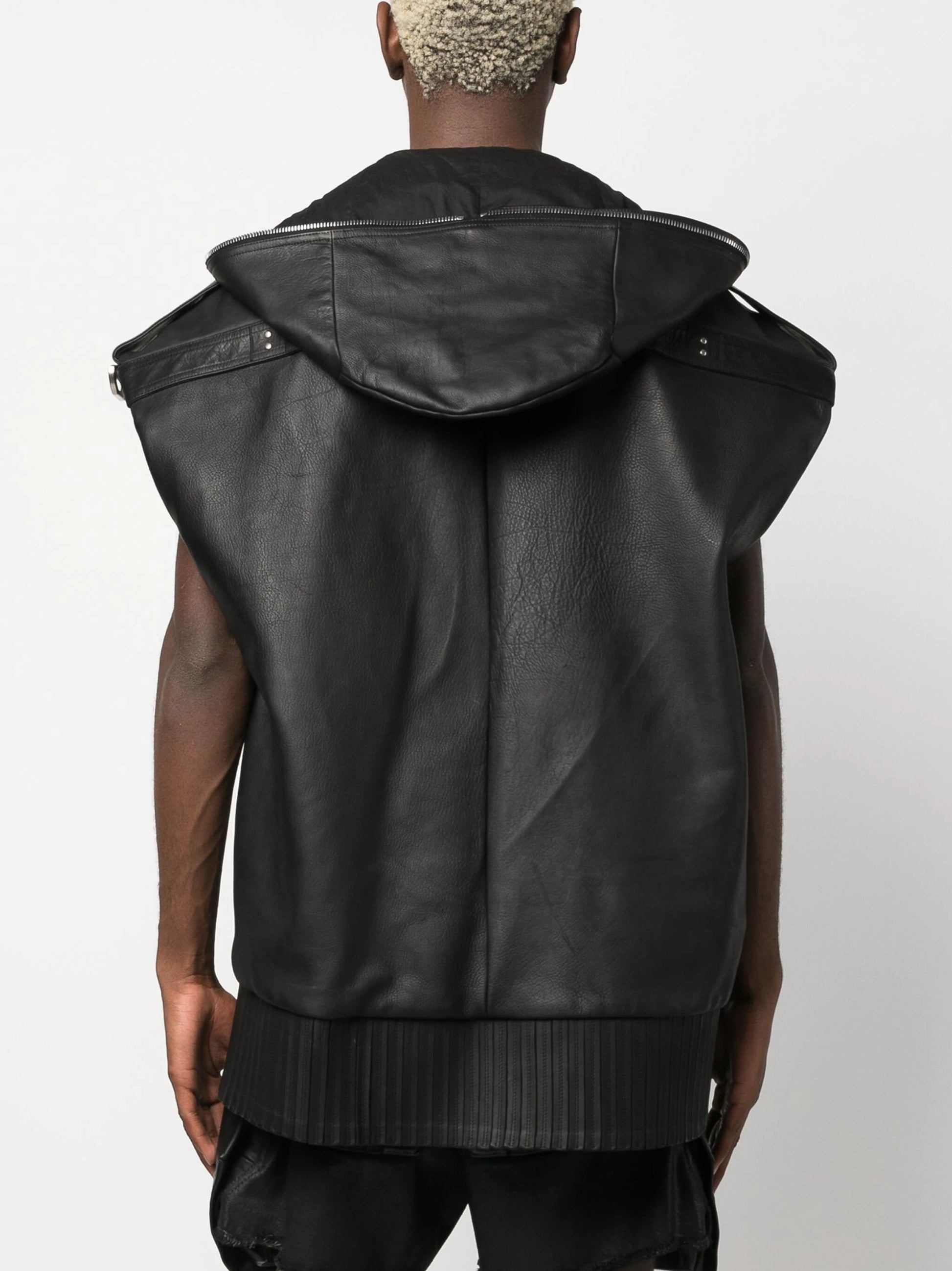 Lido sleeveless hooded leather jacket from Rick Owens featuring black, calf leather, panelled design, ring embellishment, slouchy hood, front zip fastening, sleeveless, two slit pockets at the chest, ribbed hem and full lining.