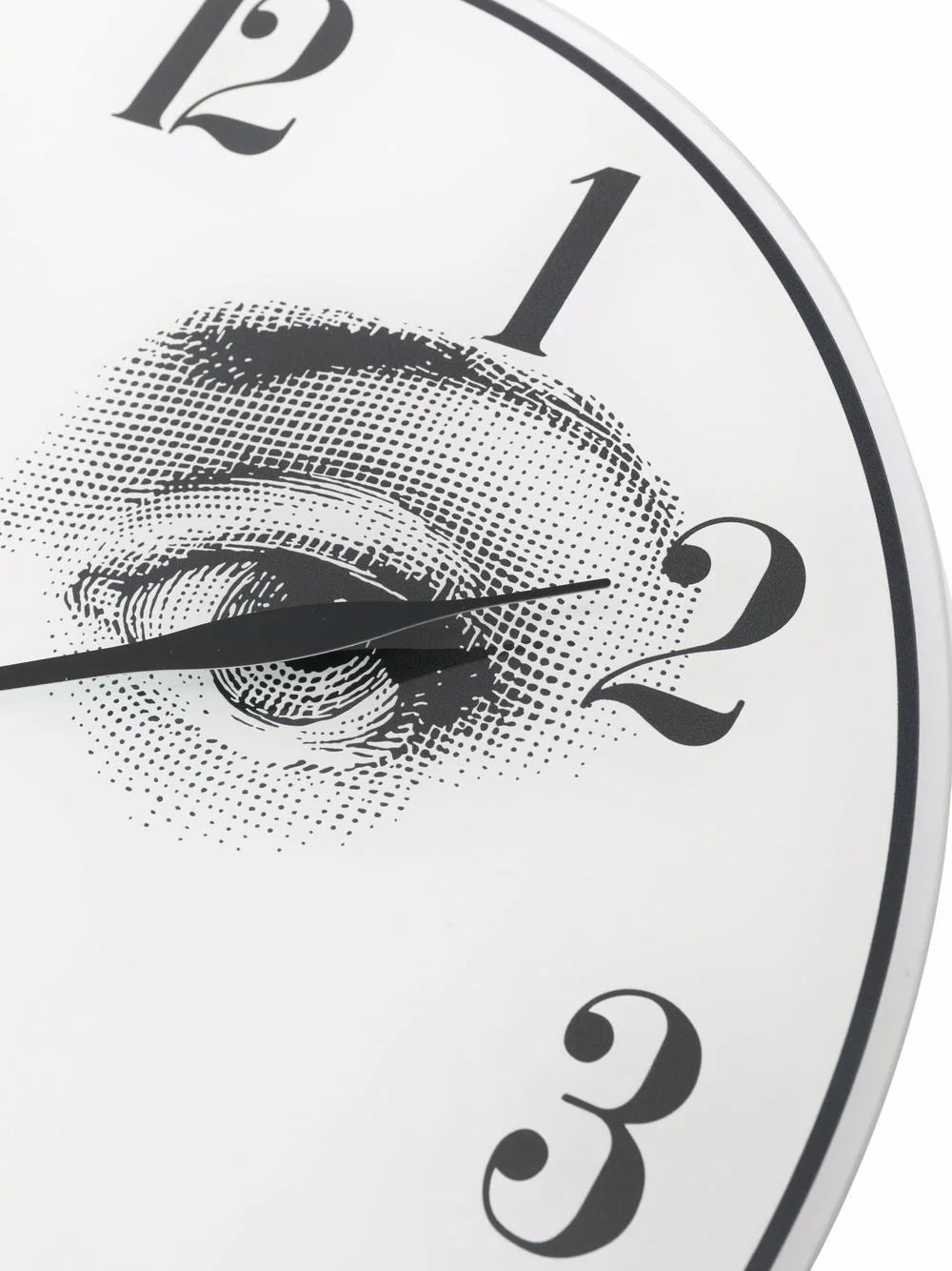 White/black glass Lina Cavalieri clock from FORNASETTI featuring signature Lina Cavalieri print, two-tone design and battery-operated movement.