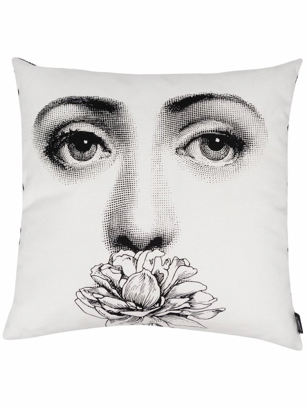 White/black cotton Lina Cavalieri-print cushion from FORNASETTI featuring square shape, signature Lina Cavalieri print and logo patch to the side.