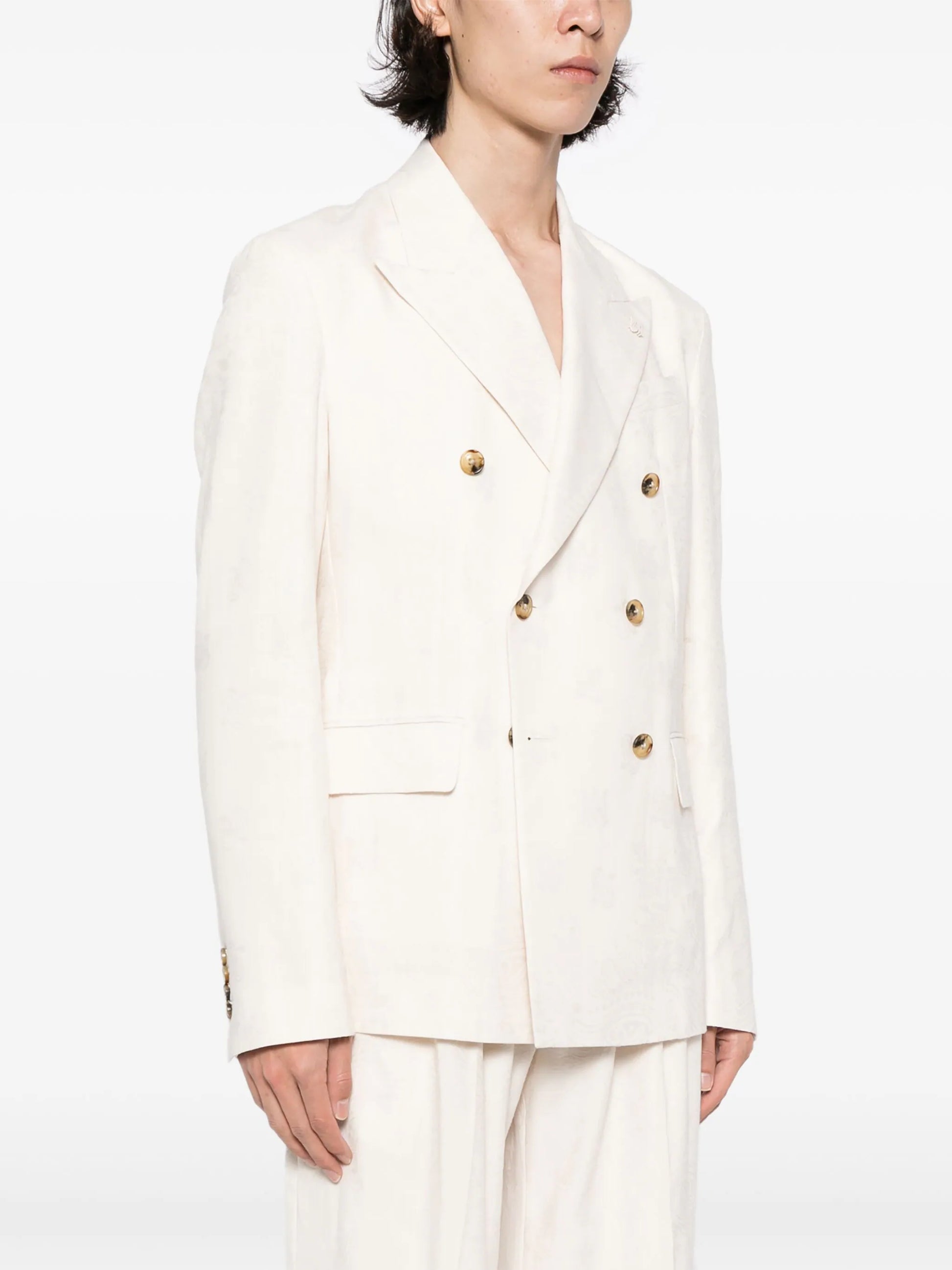 ivory white linen-cotton blend double-breasted button fastening logo-embroidered collar two side flap pockets buttoned cuffs This item contains at least 50% materials which are certified or widely recognised as having a lower environmental impact through production and/or manufacturing processes that reduce water consumption and the use of harmful chemicals, or re-use by-products of the production process.