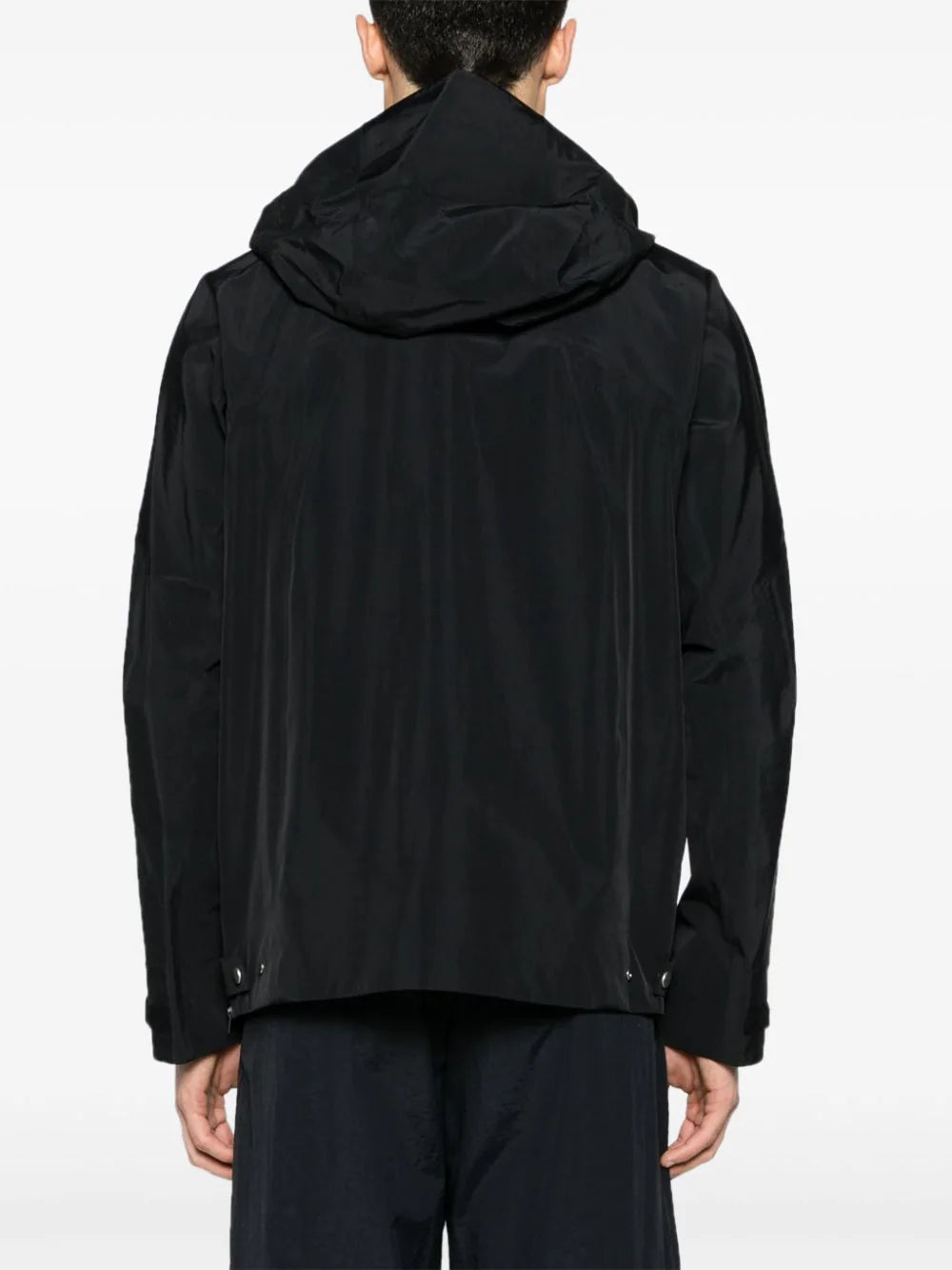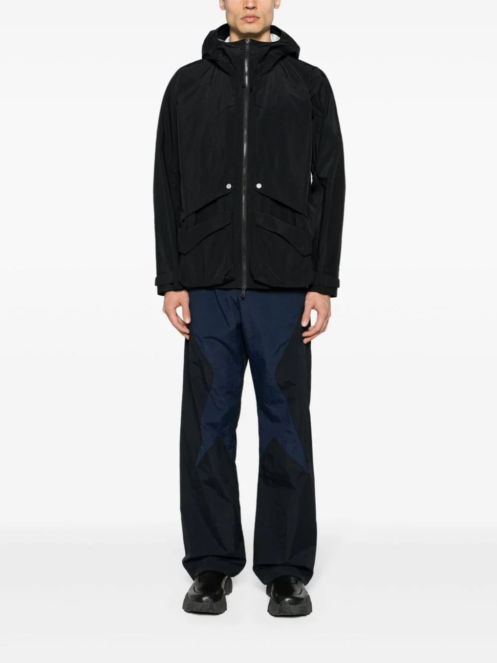 black panelled design drawstring hood high neck front two-way zip fastening long sleeves touch-strap cuffs multiple concealed front pockets two detachable front cargo pockets unlined adjustable side straps straight hem