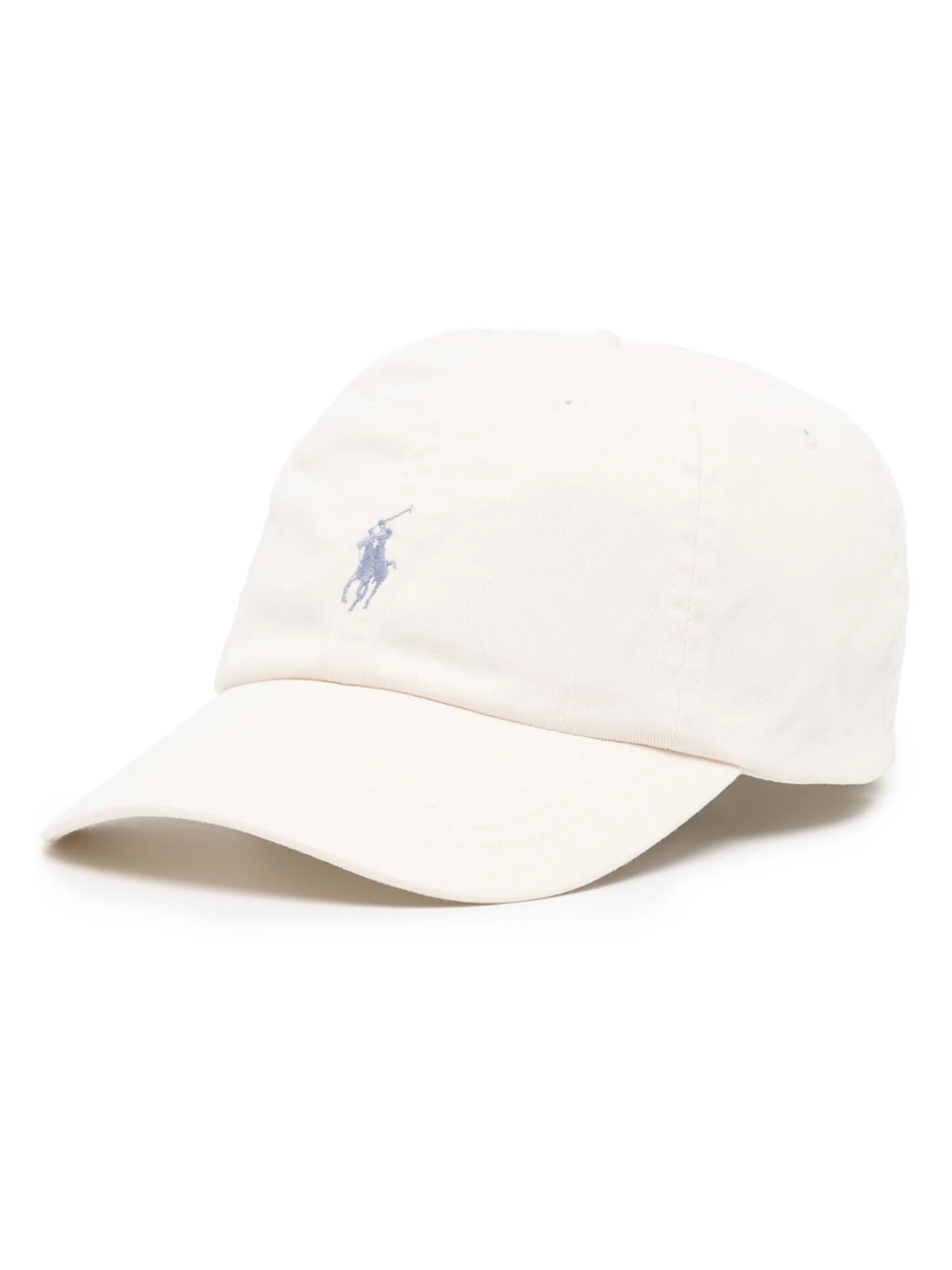 Crafted from cream white cotton twill with a durable twill weave, this baseball cap features the signature Polo Pony motif embroidered on the rear. Its six-panel construction and round crown provide a classic fit, while the curved peak offers practical sun protection. An adjustable strap at the back ensures a personalized and comfortable fit, making it a versatile accessory for everyday wear.