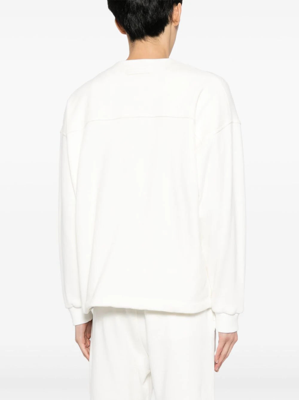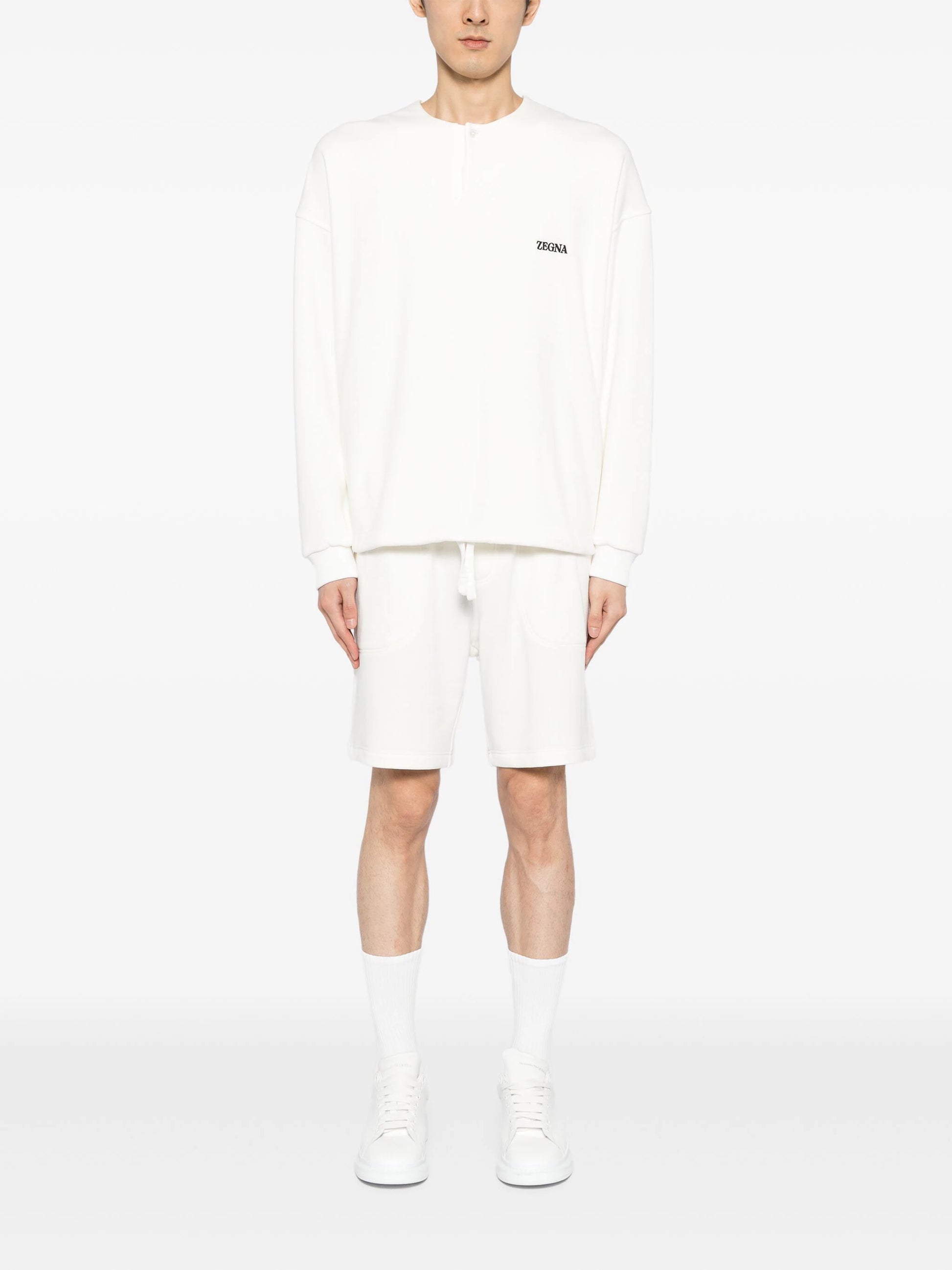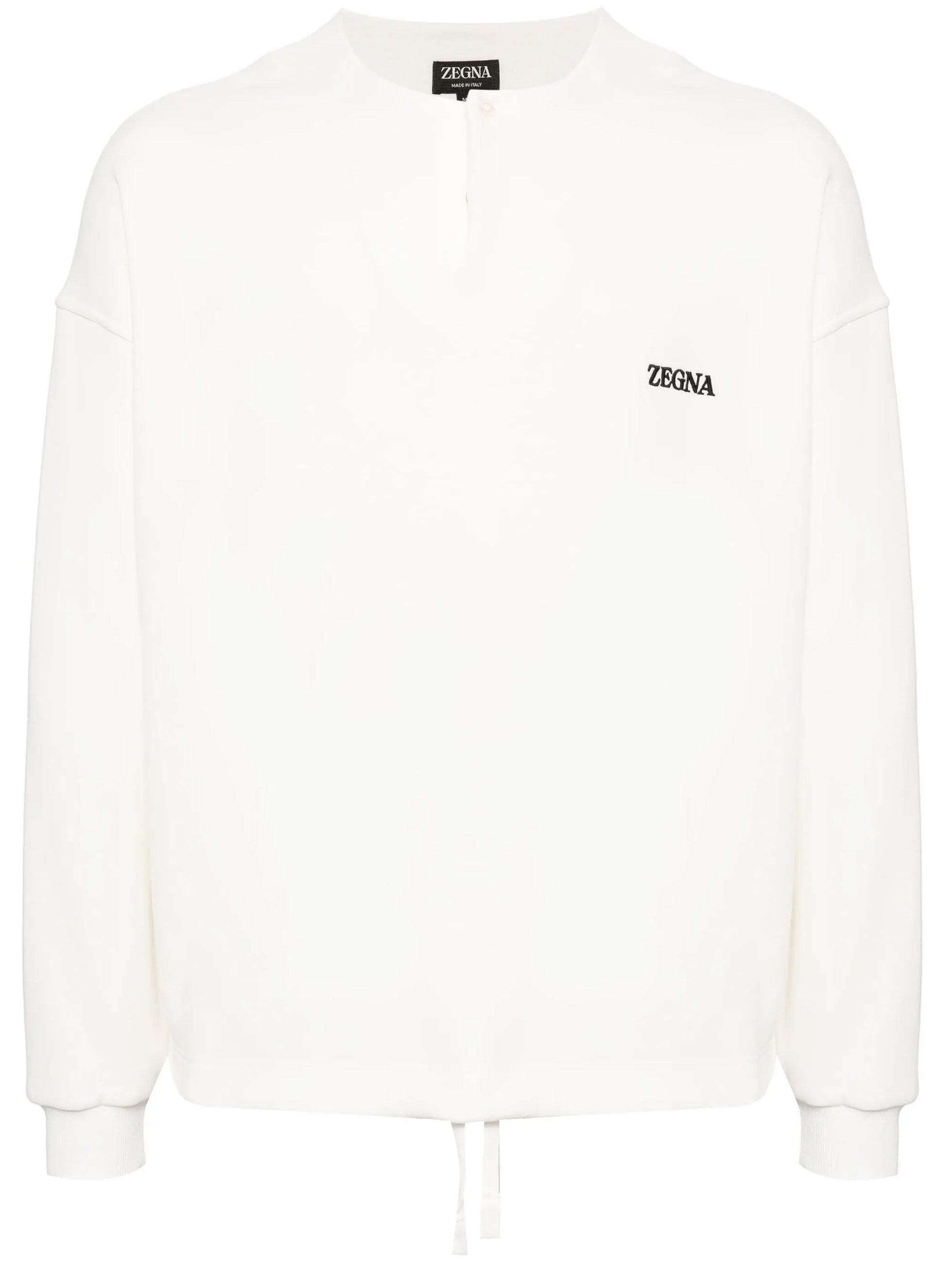 white cotton blend jersey texture embroidered logo at the chest crew neck short front button fastening long sleeves ribbed cuffs drawstring hem straight hem