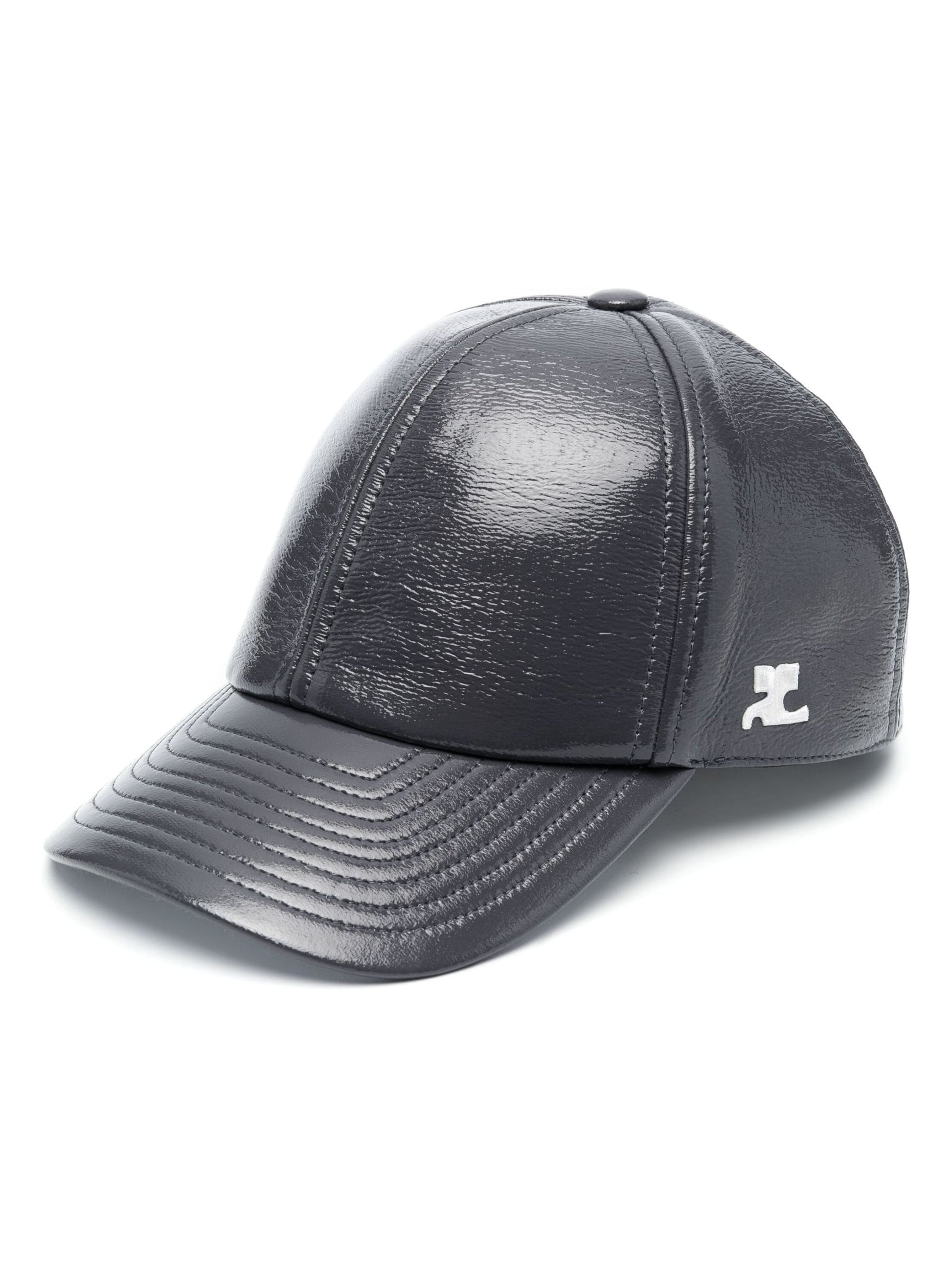 logo-embroidered glossy-finish cap from Courrèges featuring dark grey, cotton, glossy finish, tonal stitching, embroidered logo to the side, fabric-covered button at the crown, adjustable strap to the rear and curved peak.