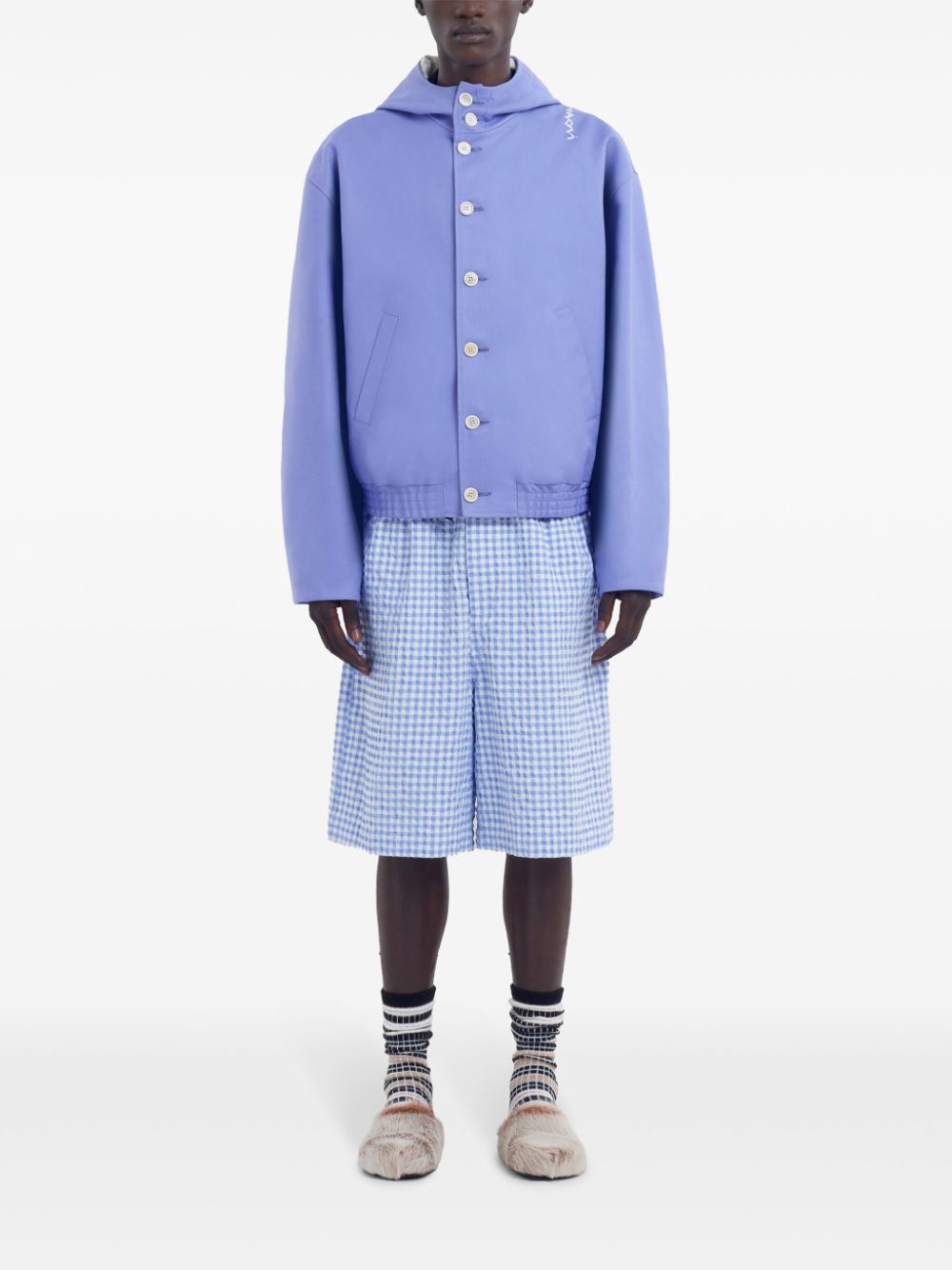 This hooded jacket in lavender purple is made of cotton and boasts a classic and stylish embroidered logo on the side. With a button fastening, high neck, and elasticated hem, this jacket provides both warmth and comfort. The two side welt pockets are perfect for storing essentials on the go.