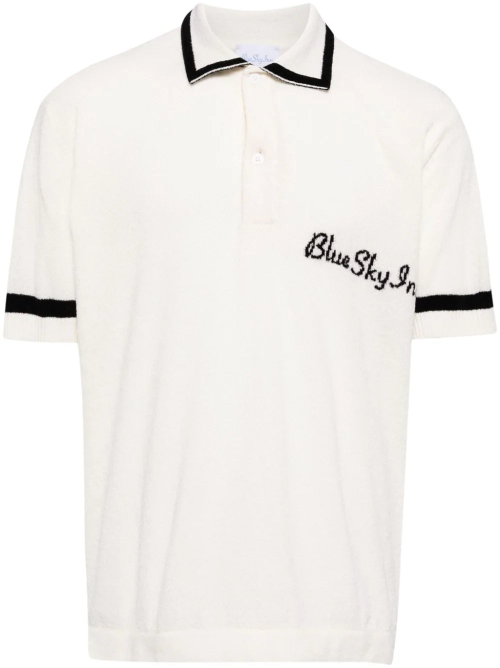 white knitted construction contrasting trim embroidered logo at the chest polo collar short sleeves front button placket straight hem