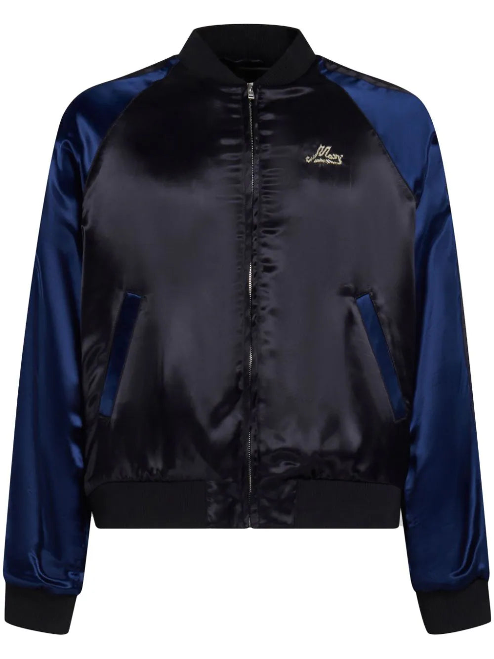 navy blue satin finish baseball collar embroidered logo at the chest embroidered logo to the rear front zip fastening two side welt pockets long raglan sleeves elasticated cuffs elasticated hem