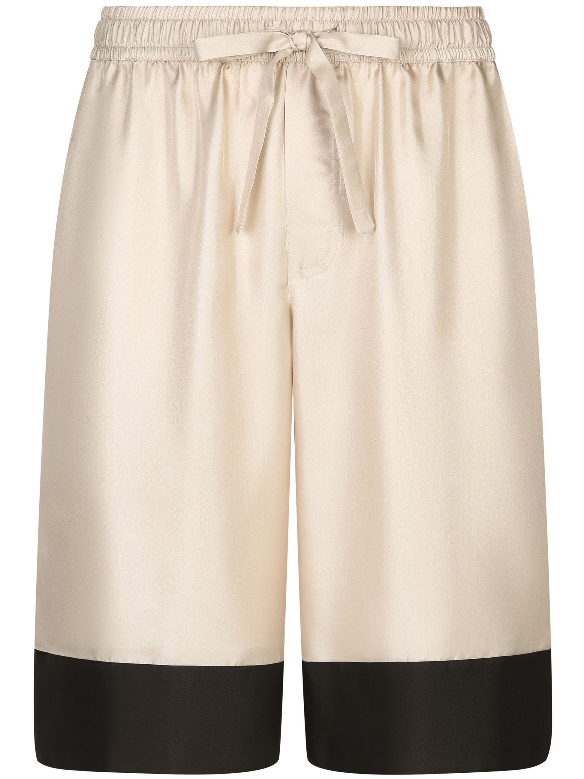 These Logo-Embroidered Silk Shorts feature a sophisticated ecru and black design with a sleek embroidered logo on the rear. The elasticated drawstring waistband offers a comfortable fit, while the knee-length style adds a touch of elegance. With two side pockets and a rear patch pocket, these shorts are both stylish and practical.