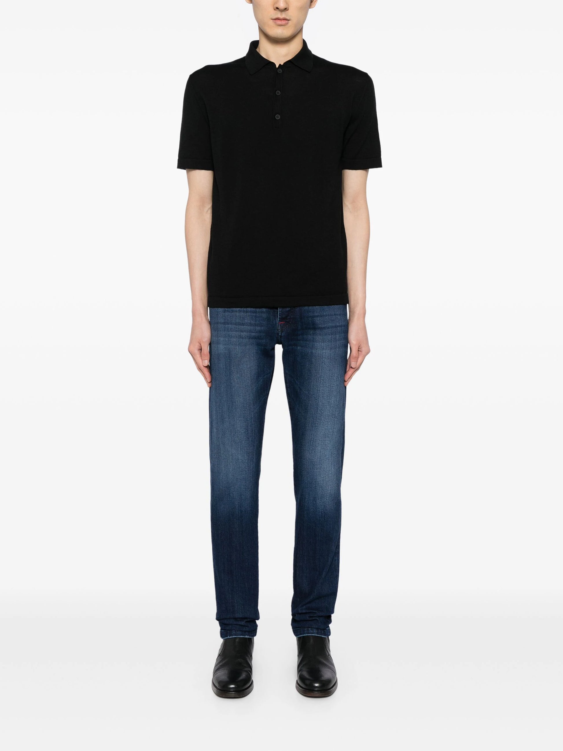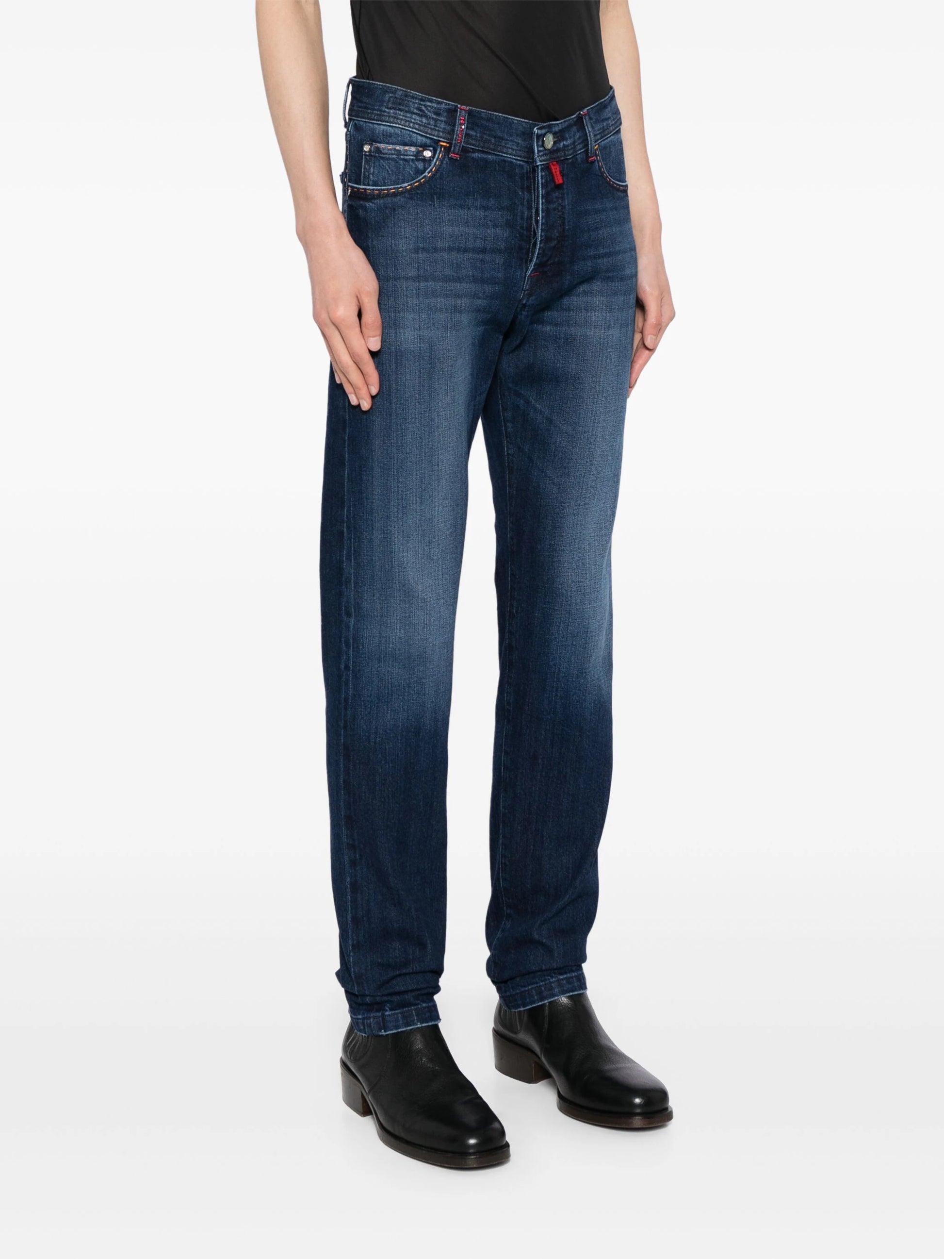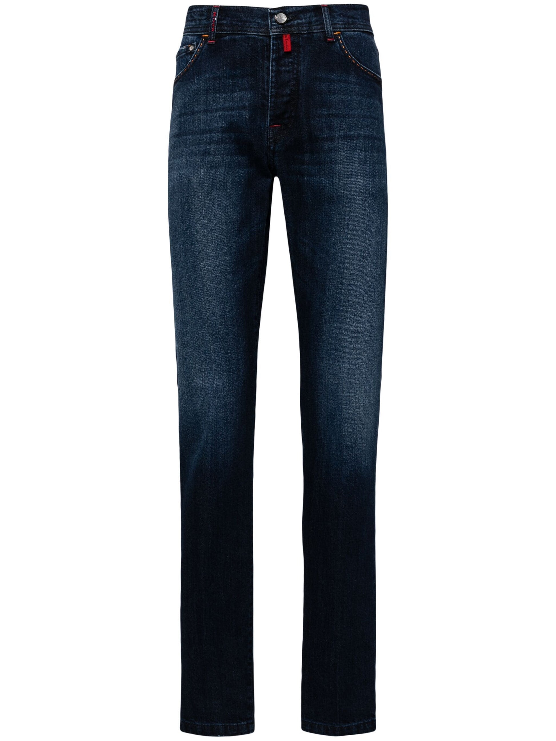 indigo blue stretch-cotton washed denim embroidered logo whiskering effect rivet detailing contrast stitching appliqué logo mid-rise concealed fly and button fastening belt loops straight leg classic five pockets