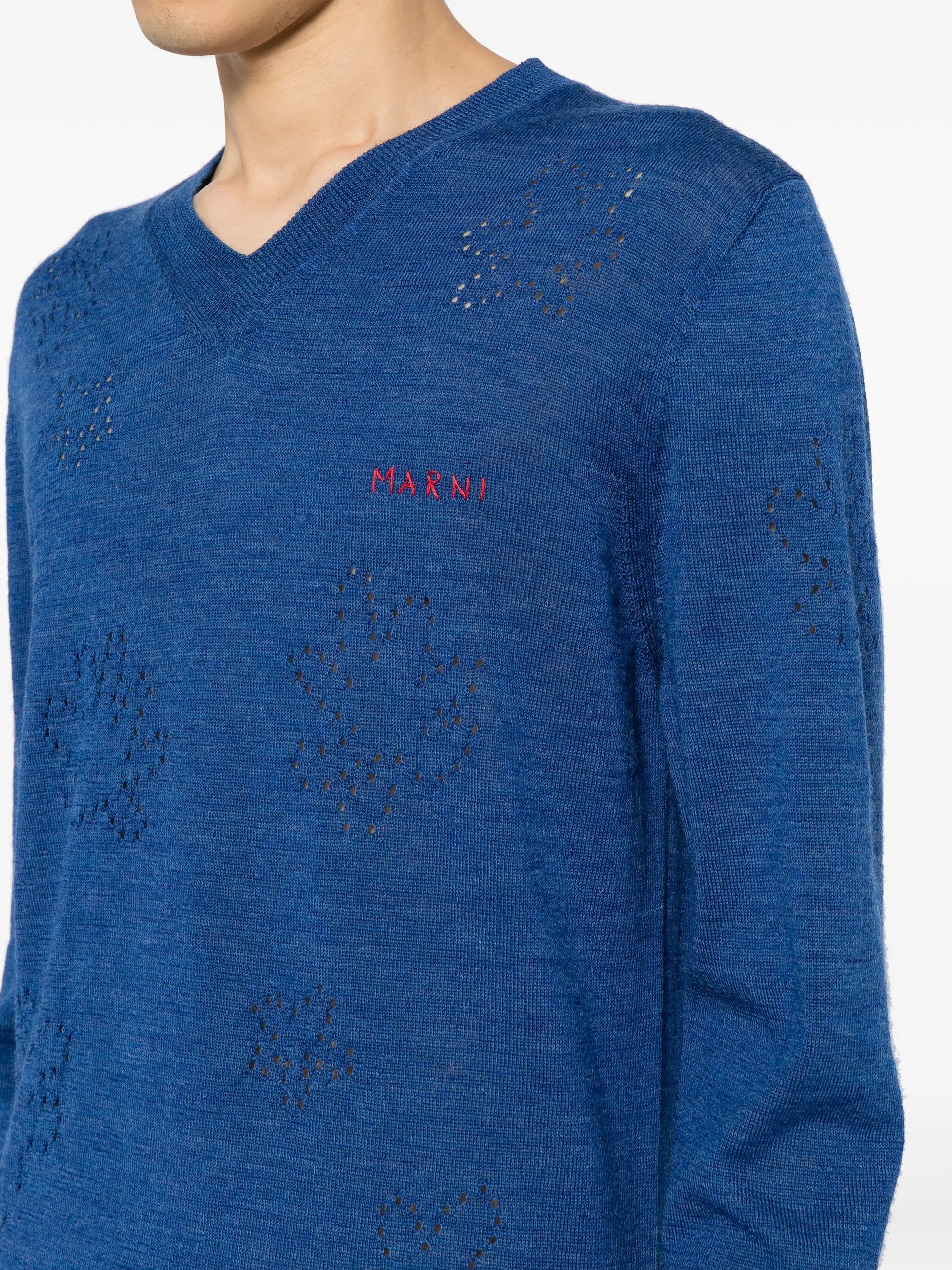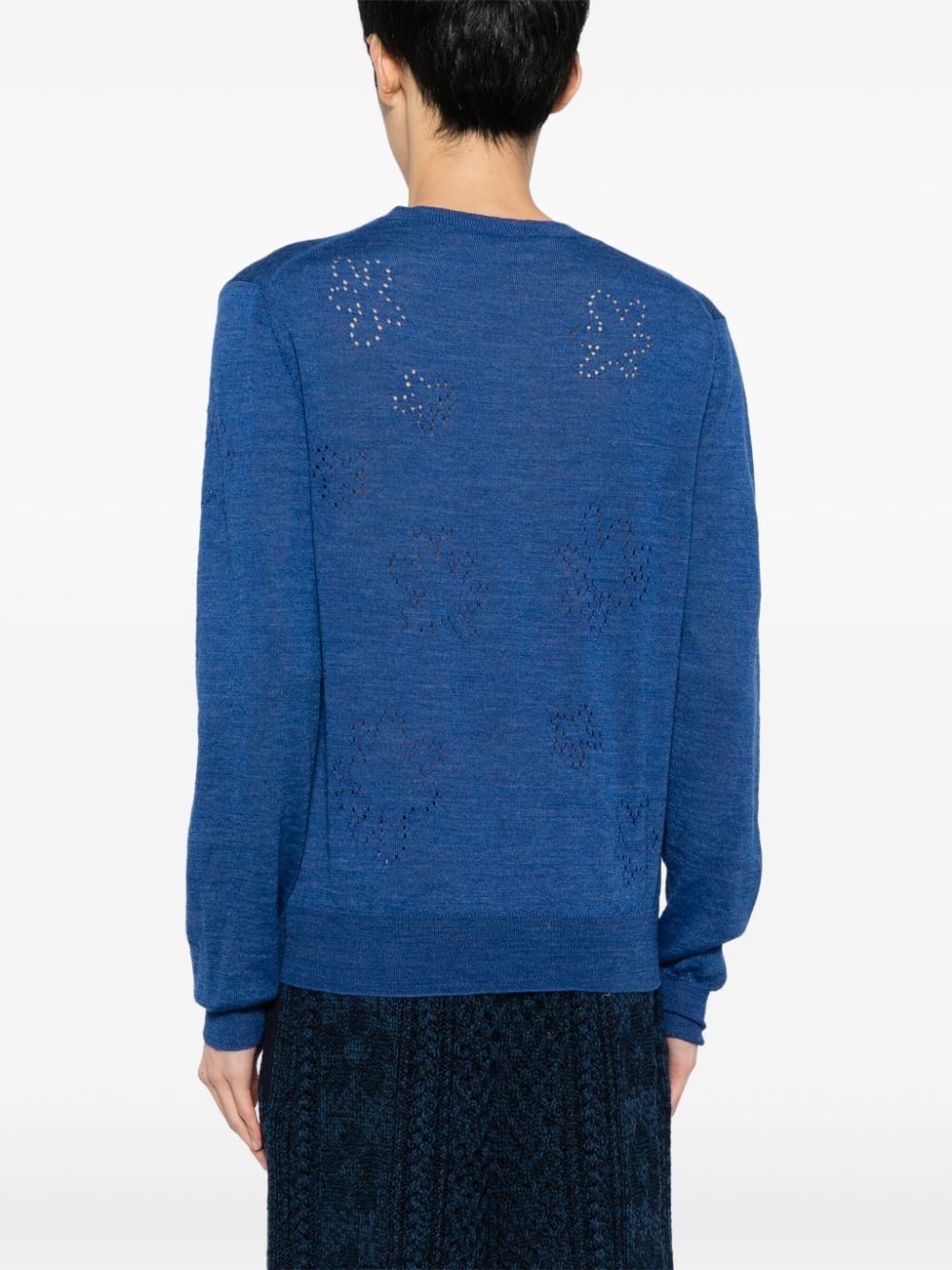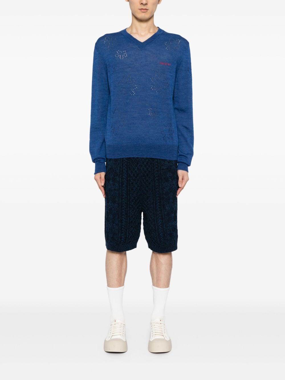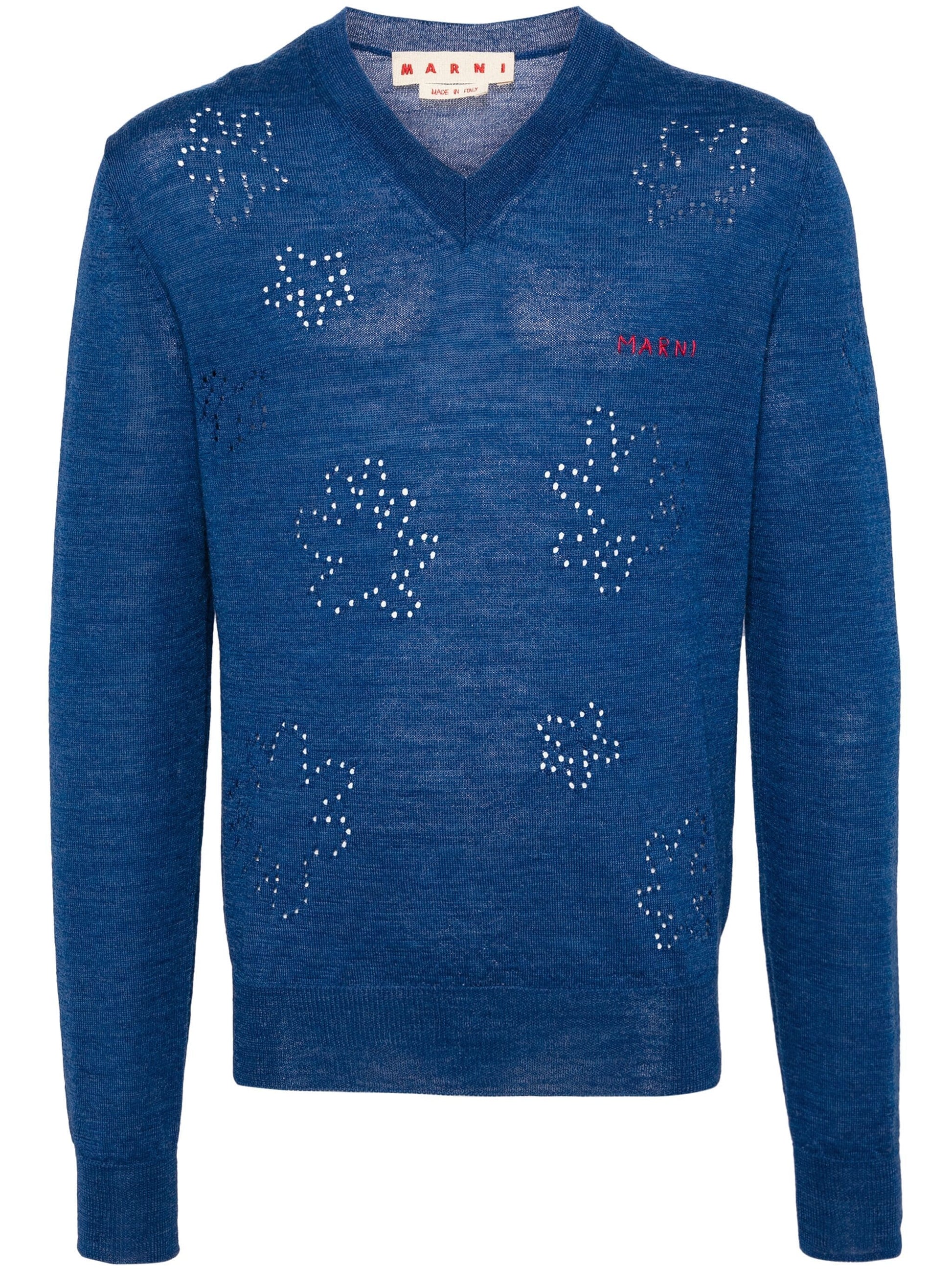 electric blue virgin wool fine knit perforated detailing embroidered logo at the chest ribbed trim V-neck long sleeves straight hem