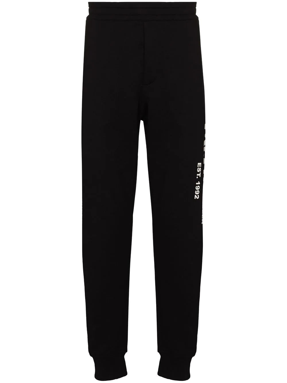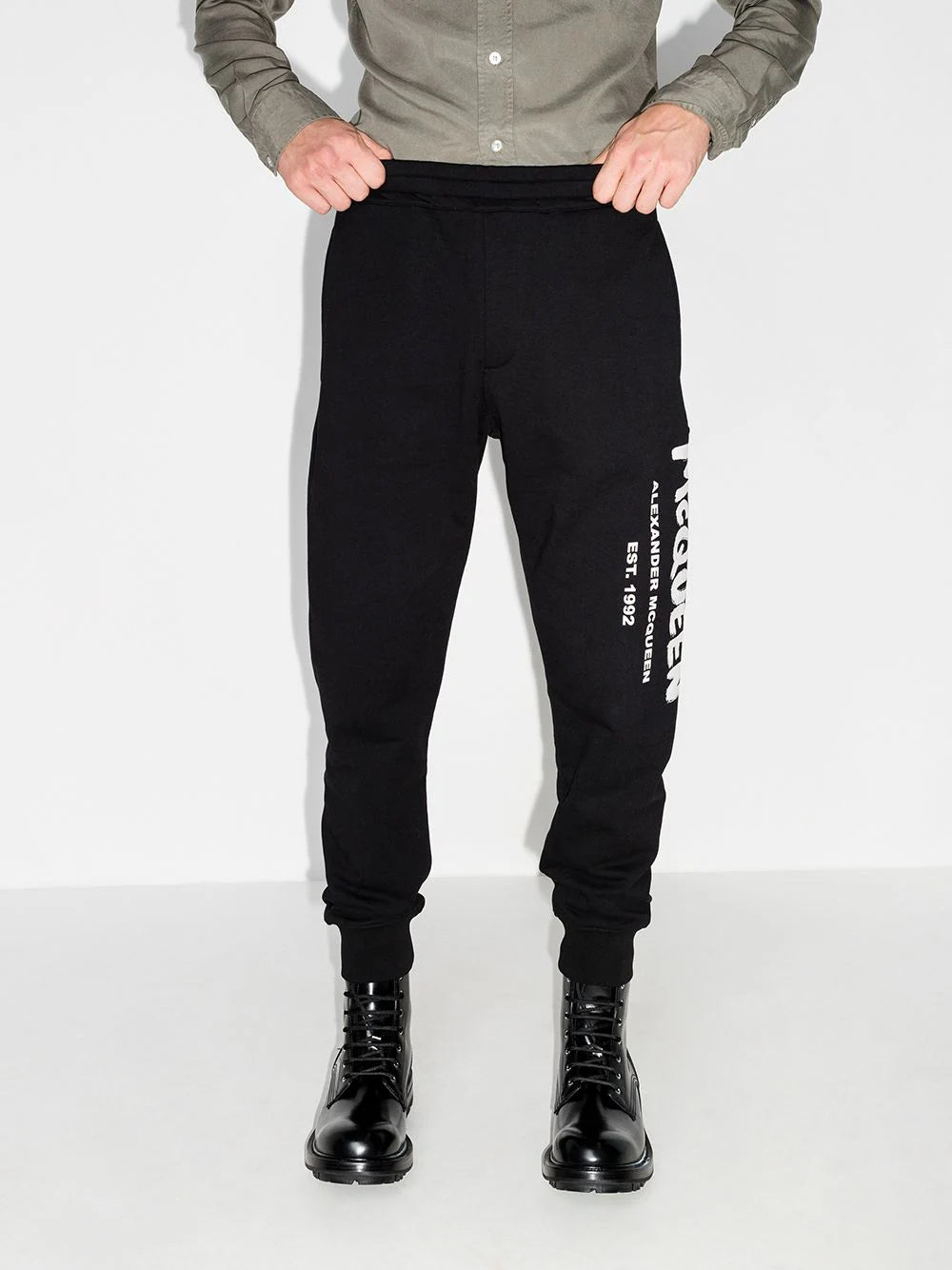 Black/ivory cotton logo graffiti print track pants from Alexander McQueen featuring graffiti print, elasticated waistband, tapered leg, elasticated ankles, two side slit pockets and rear zip-fastening pocket.