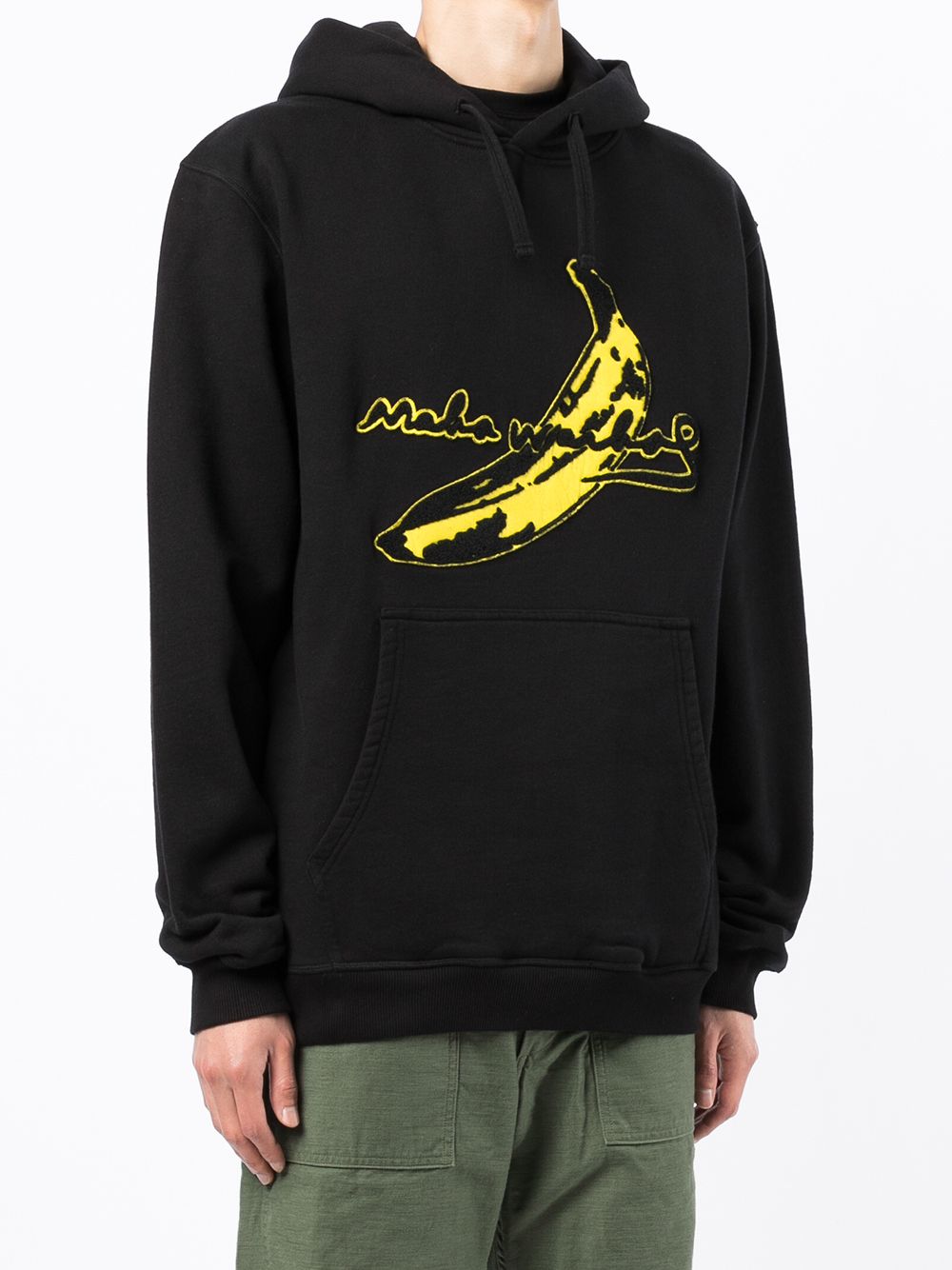 Black cotton logo-patch cotton hoodie from MAHARISHI featuring jersey knit, logo patch to the front, classic hood, long sleeves, elasticated cuffs and elasticated hem.