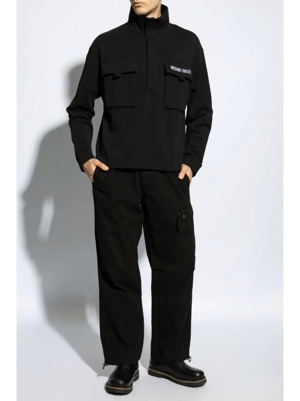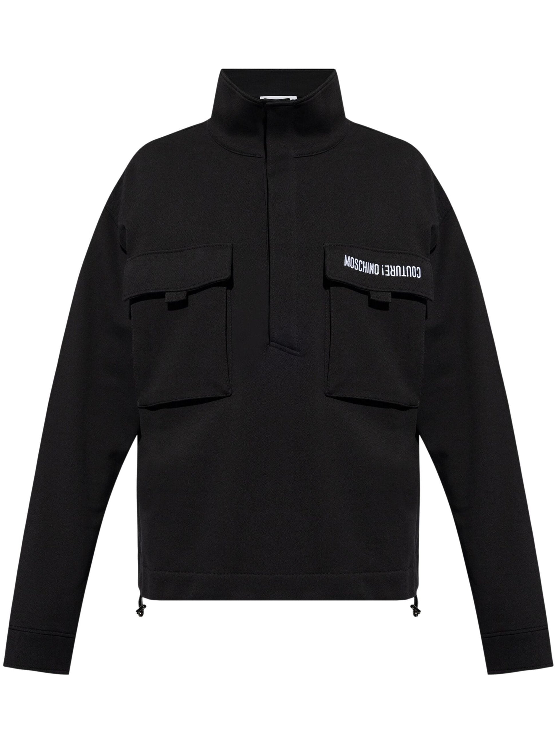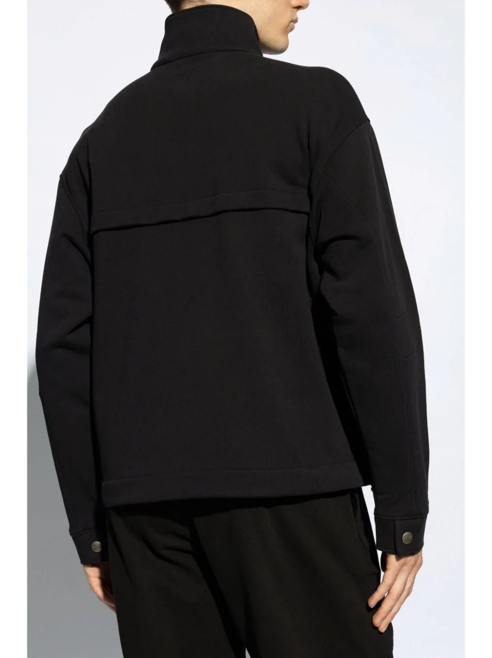 black cotton jersey texture embroidered logo high neck snap-fit fastening two chest flap pockets ribbed cuffs and hem buttoned cuffs