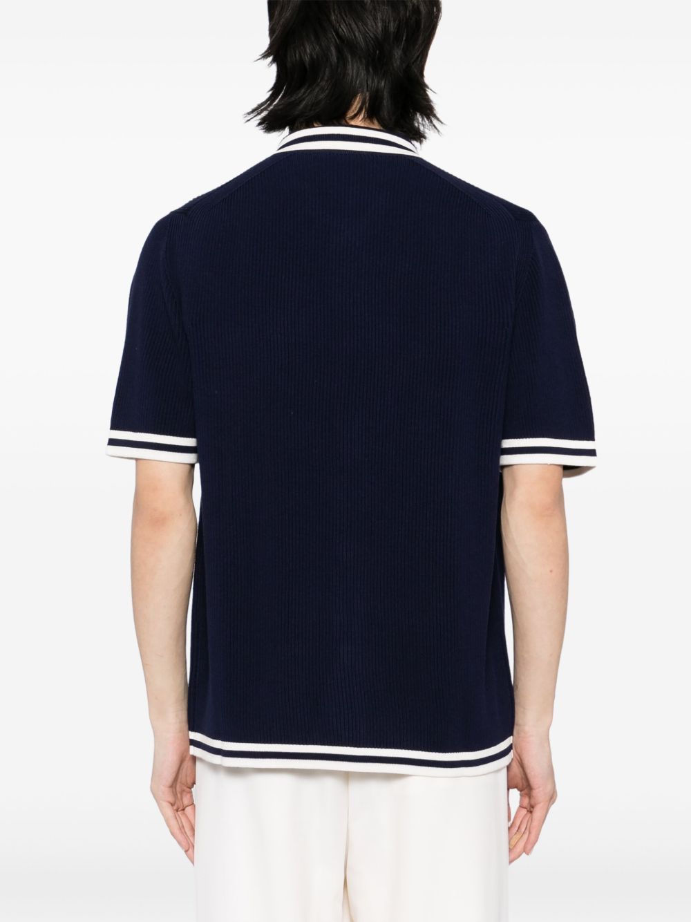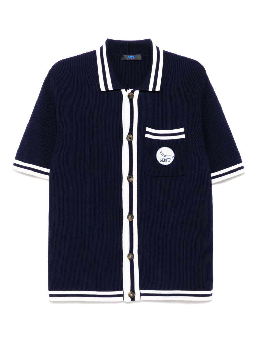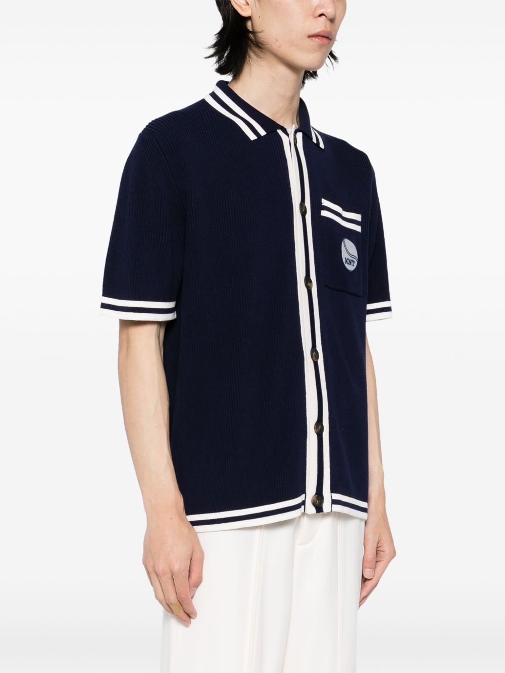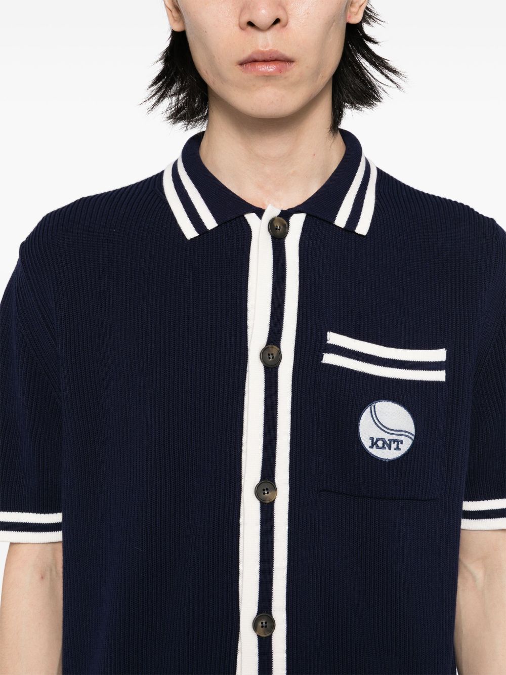 This navy blue Logo-Patch Shirt features a front button fastening and a chest patch pocket, as well as stripe detailing. The classic design paired with functional elements make this a versatile and stylish addition to your wardrobe. Perfect for any occasion, this shirt offers both comfort and sophistication.