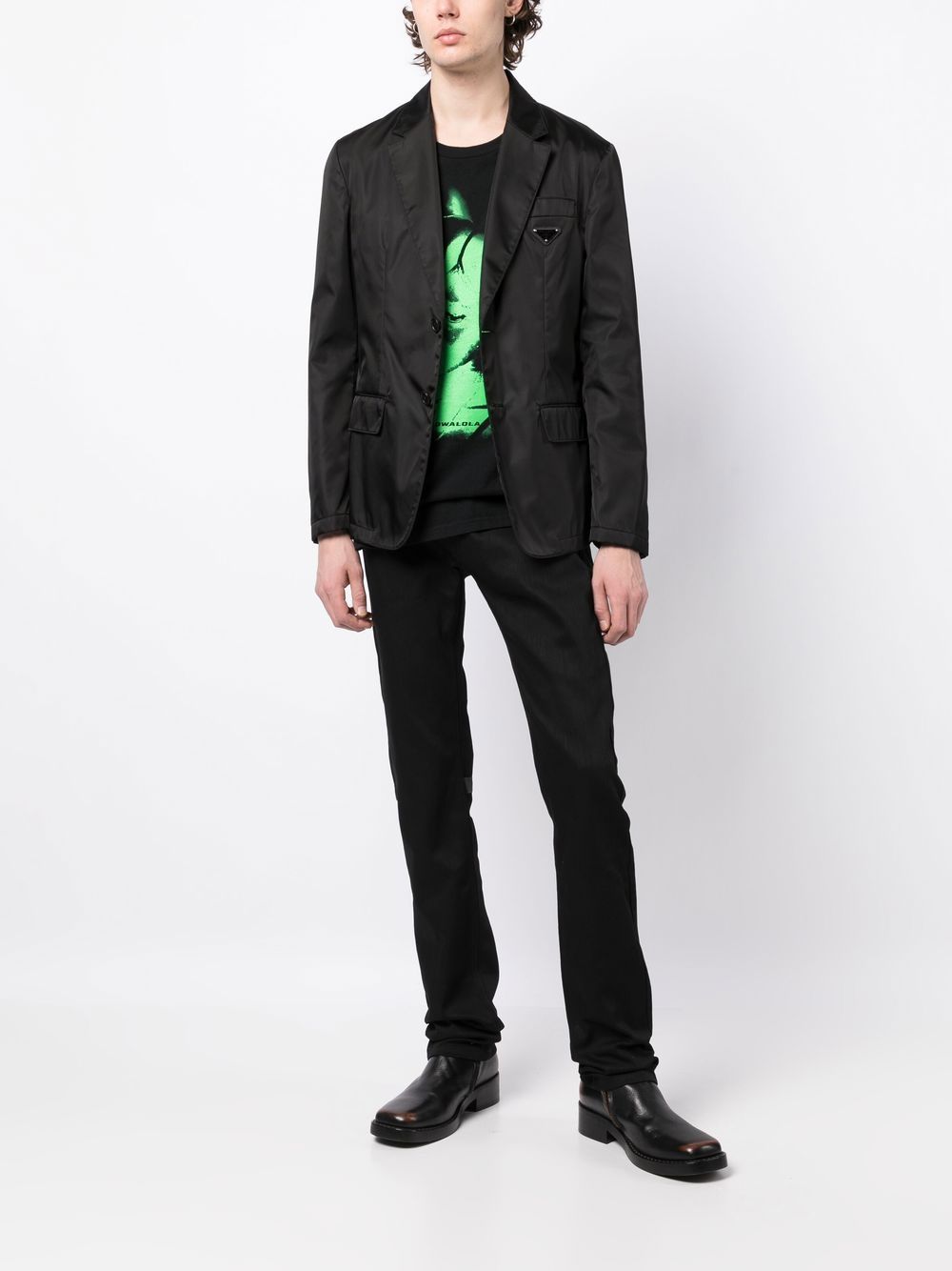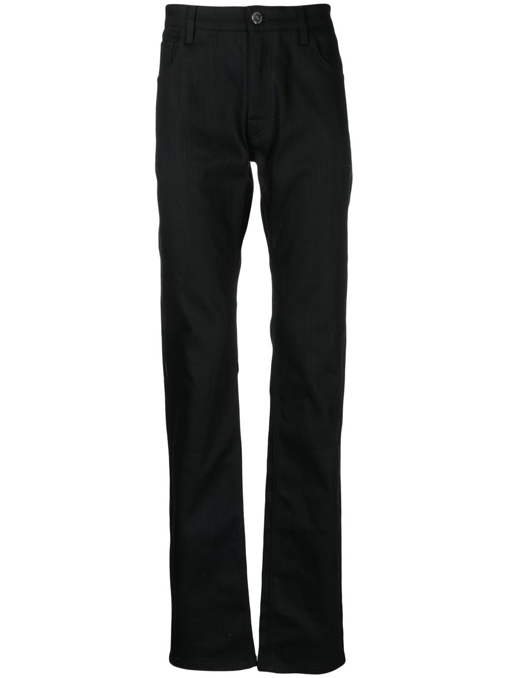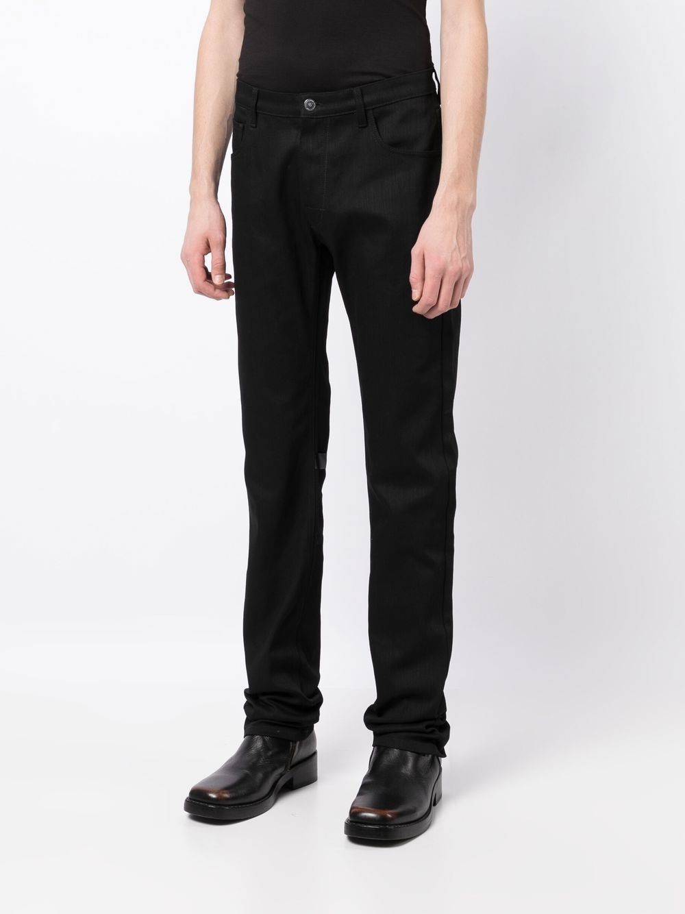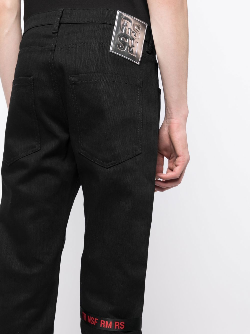 logo-patch trousers from RAF SIMONS featuring black, cotton, logo patch to the rear, logo print to the rear, belt loops, button fly fastening and two rear patch pockets.