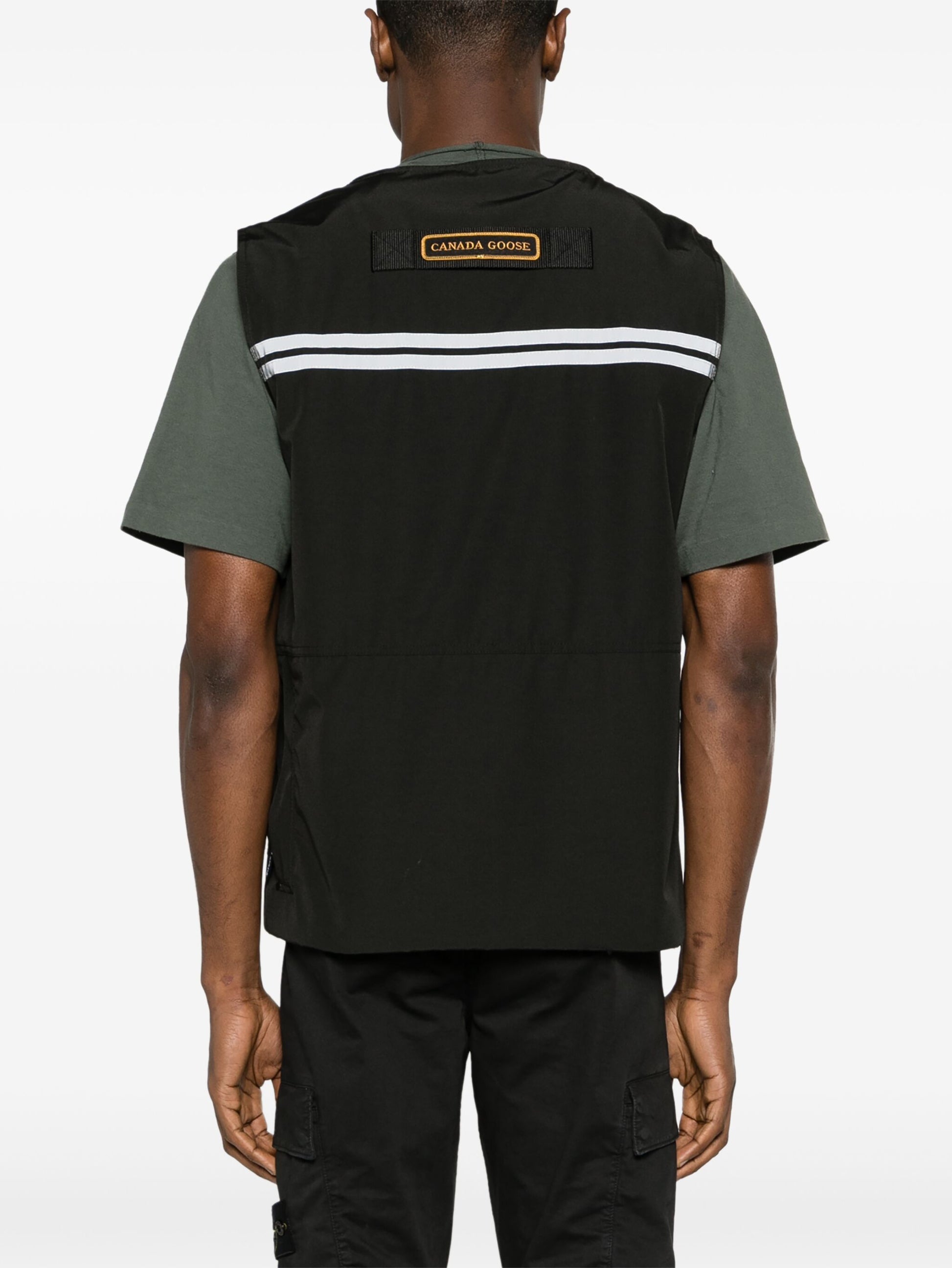 Stay stylish and comfortable with our Logo-Patch Zip-Up Vest. The black logo patch and reflective stripe detailing add a touch of sophistication, while the D-ring findings and multiple pockets provide convenience and functionality. With a V-neck front and full lining, this vest is perfect for any occasion. Stay effortlessly cool and on-trend with our vest.