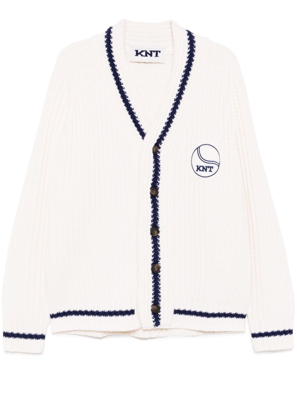 This cream white/blue wool knitted cardigan features a stripe trim, front button fastening, and ribbed cuffs and hem. Stay warm and stylish with this logo patched cardigan. Made with high-quality materials and expert craftsmanship, this cardigan is perfect for any occasion.